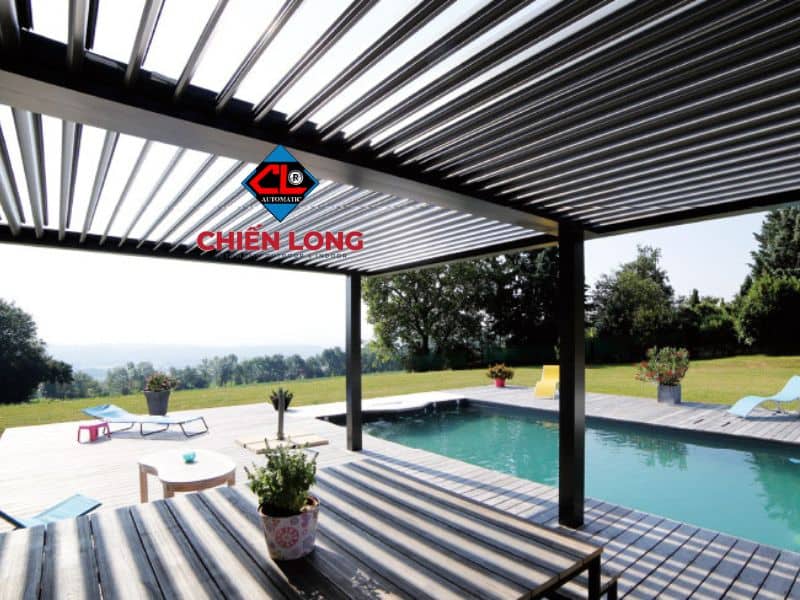 Giàn che nắng mái nhôm chớp tự động có thể được lắp đặt tại hồ bơi. Với chức năng che nắng, che mưa, sẽ giúp tăng hiệu suất sử dụng hồ bơi. Từ đó, nâng cao khả năng thu hút khách hàng, tối đa hoá lợi nhuận cho các nơi kinh doanh dịch vụ hồ bơi ngoài trời hay resort, khách sạn.