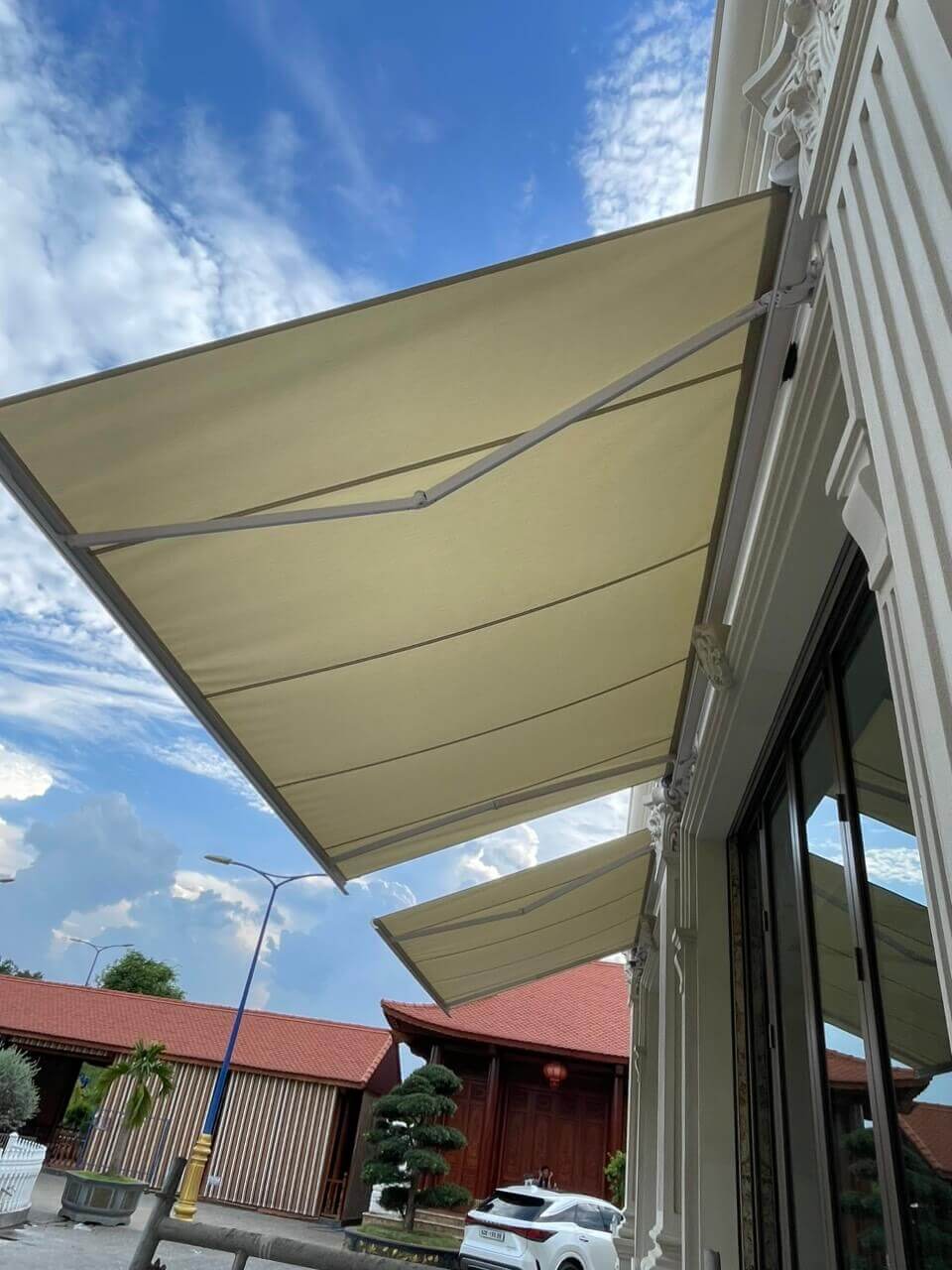 Vì vậy, Chiến Long đã tư vấn cho công ty tại Biên Hoà Đồng Nai cân nhắc sử dụng 2 bộ mái hiên tự động dành cho siêu biệt thự làm từ khung nhôm chịu lực cùng vải bạt Polyester cao cấp. Nhờ vô vàn ưu điểm vượt trội, sản phẩm tự tin chinh phục đến cả khách hàng khó tính nhất, mang đến hệ thống che nắng che mưa đi đầu về công năng và thẩm mỹ nhưng với chi phí lại cực phải chăng.