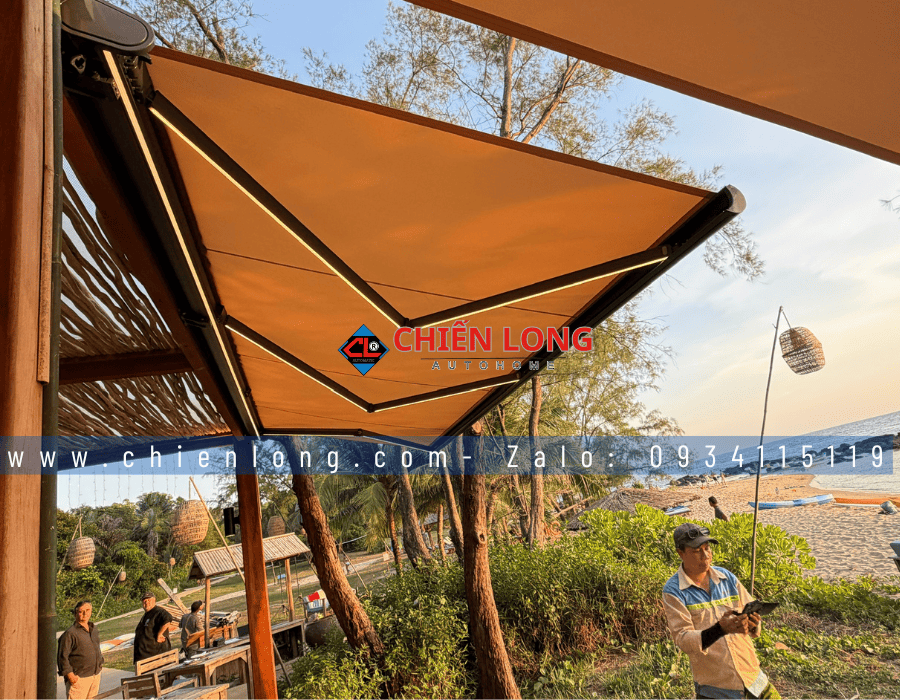 Mái hiên tự động là hệ mái che sử dụng motor điện nhập khẩu, cho phép thu vào – mở ra nhanh chóng bằng remote hoặc công tắc. Vải bạt cao cấp có khả năng chống nắng, chống tia UV, chống thấm nước, phù hợp khí hậu nóng ẩm, mưa nhiều tại Việt Nam.