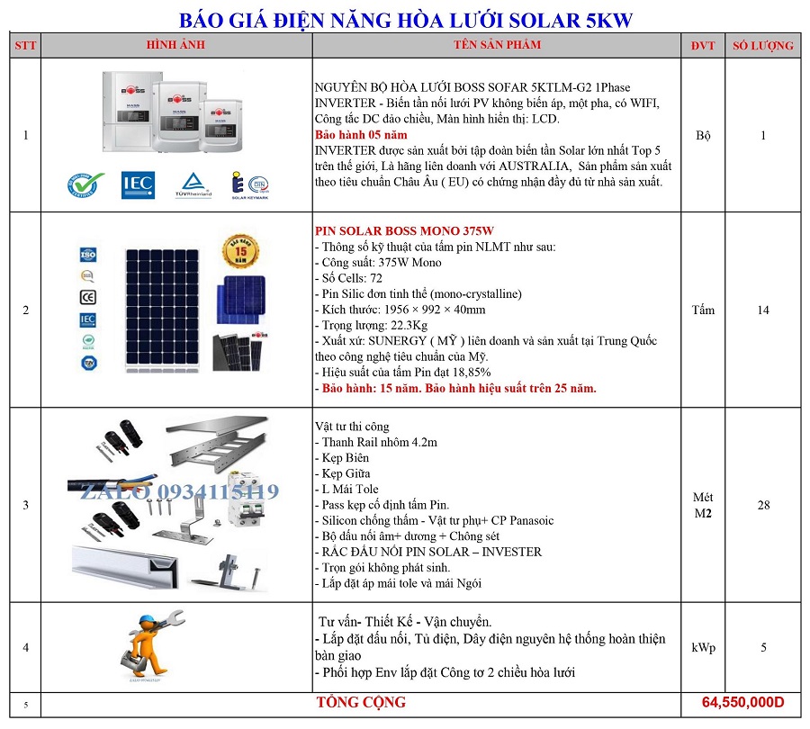 Báo giá điện năng lượng mặt trời 5KW hòa lưới
