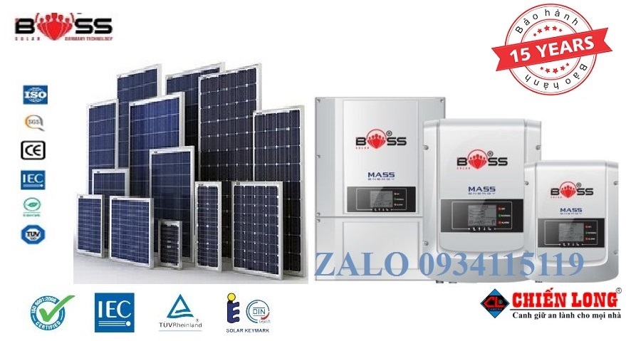 - Tấm pin Solar panel Boss, được sản xuất bởi công ty Solar Synergy Trung Quốc liên doanh với Mỹ ( USA). Sản phẩm được sản xuất theo tiêu chuẩn Châu âu ( EU) có chứng nhận đầy đủ khi khách hàng mua hàng.