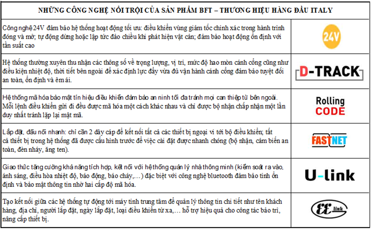 - BFT là Công Ty hàng đầu trong ngành tự động hóa cổng trượt và nổi tiếng về chất lượng vượt trội. Hệ thống cổng trượt của chúng tôi phù hợp với các trình.