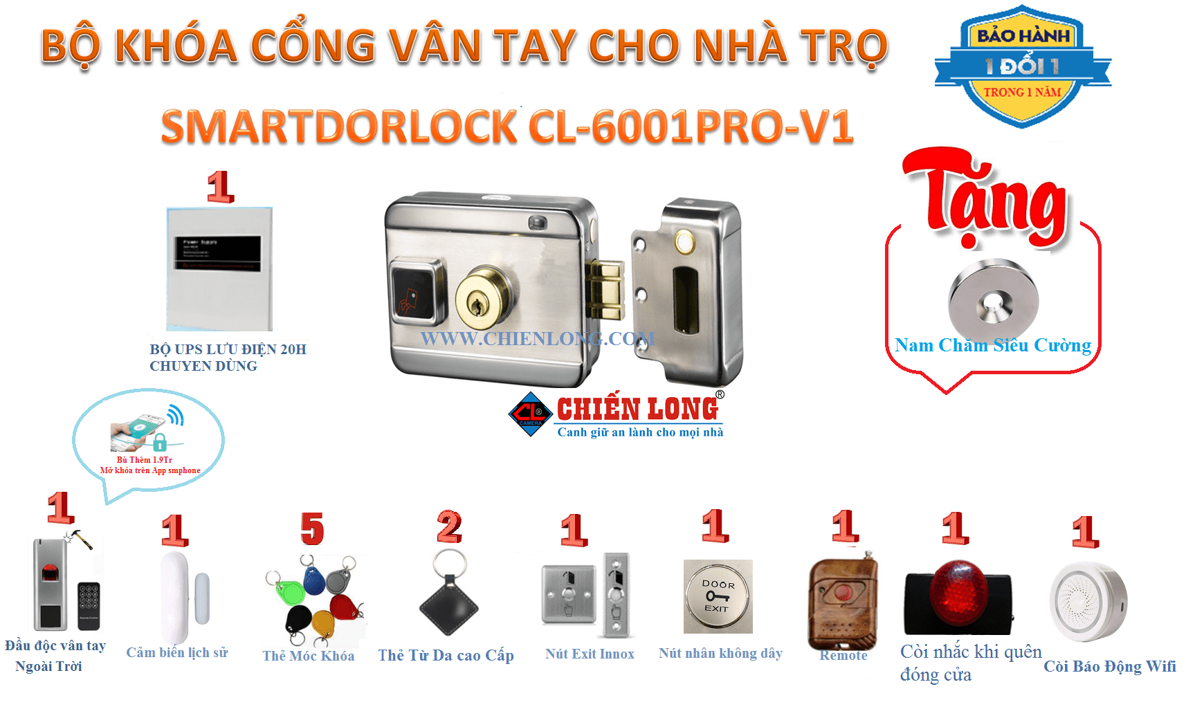 Bộ Khóa Cổng Vân Tay Chống Trộm cho nhà trọ Smartdorlock CL-6001PRO-V1