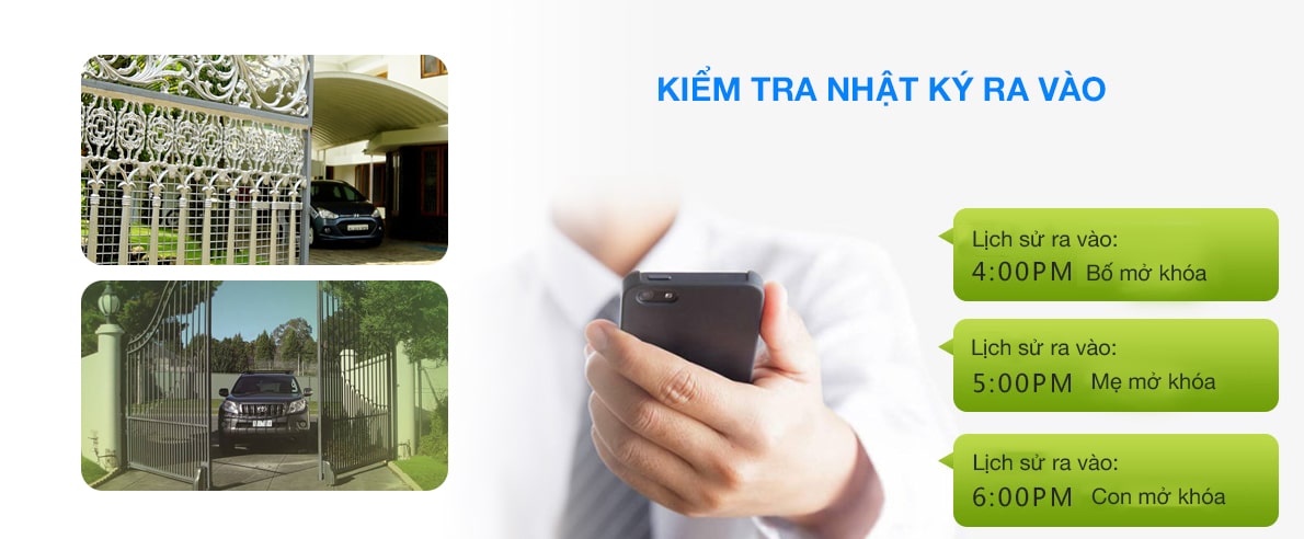 Ứng dụng trên App điện thoại thông minh được mở rộng thêm trong khóa cổng thông minh giúp bạn có thể Kiểm tra quản lý cửa nhà bạn đang đóng hay đang mở, Kiểm tra lịch sử ra vào các thành viên trong Gia Đình Bố Mẹ người thân khi về nhà.