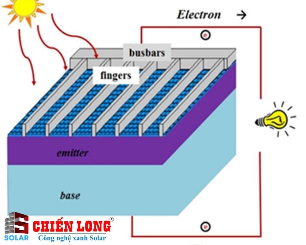 Dòng điện được tạo ra là nhờ một phần vào sự tự do di chuyển của các electron bị bật ra đó. Nhưng đến đó thì cũng mới chỉ hoàn thành ½ nhiệm vụ của cell pin. Để dòng điện thực sự được tạo ra, các electron cần được dồn vào để tạo nên dòng chảy, các cell pin cần tiếp tục làm thêm nhiệm vụ. Song, dòng chảy vừa đề cập đến chính là các đường finger và busbar.