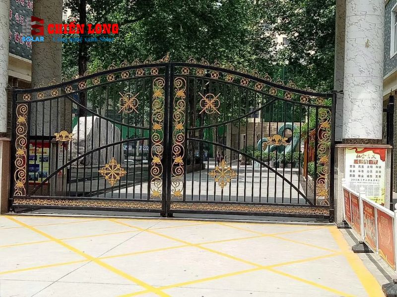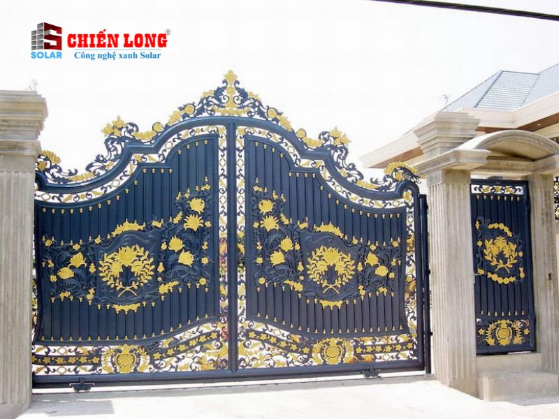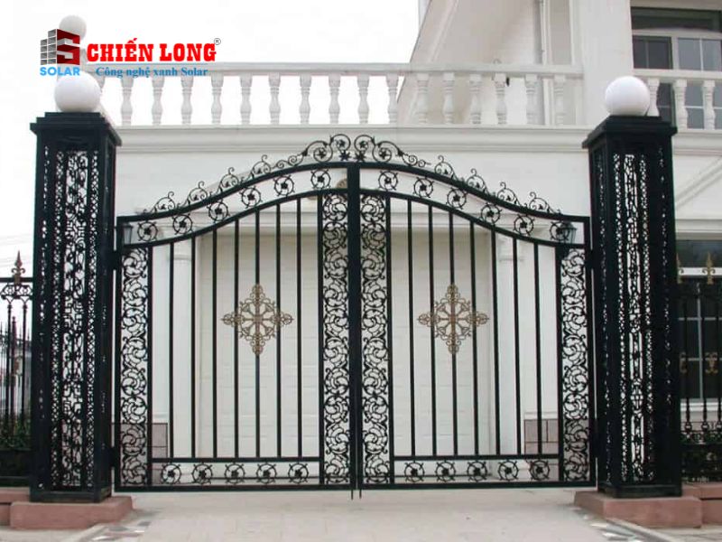 - Thiết kế cổng là sự kết hợp hài hòa giữa sự cứng cáp của sắt và đường nét mềm mại của những hoa văn họa tiết trên cổng.