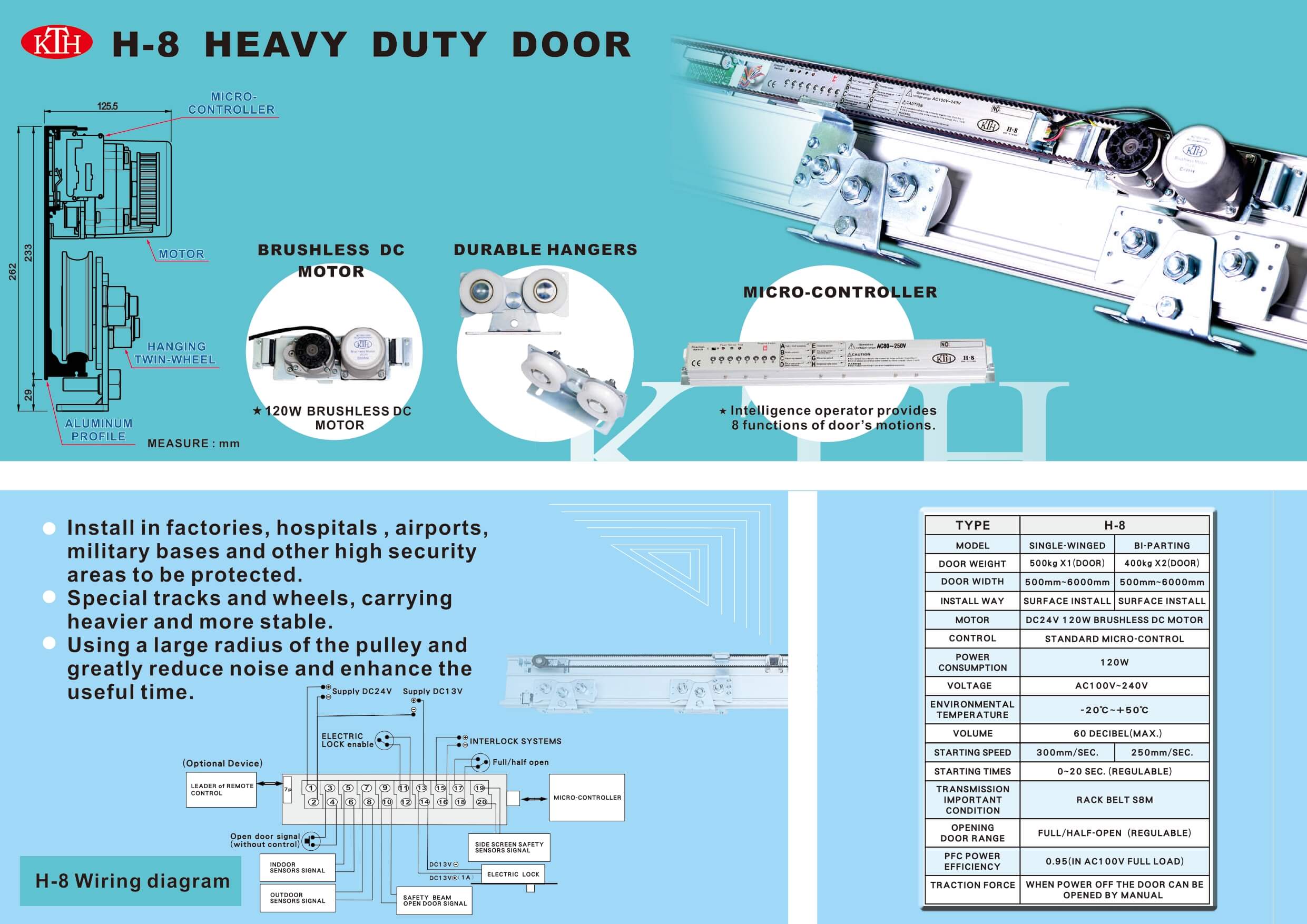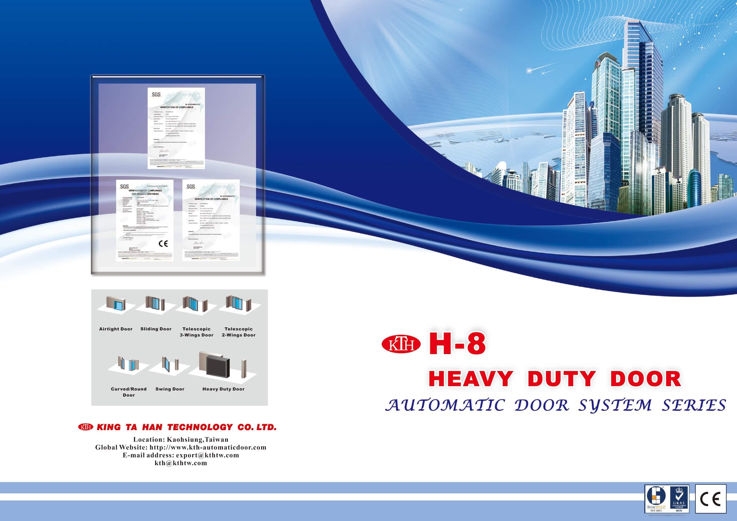 KING TA HAN ( KTH) là thương hiệu đến từ Đài Loan nhà sản xuất thiết bị tự động hàn đầu tại Đài Loan trên 25 năm qua cung cấp sản phẩm chất lượng vượt trội trên toàn cầu theo tiêu chuẩn Châu Âu. Thiết bị cửa Kính trượt tự động KTH -Model H-8 được sử dụng mở 2 cánh hoạch 1 cánh tự động mở khi có người ra vào, sản phẩm KTH -Model H-8 được sử dụng rộng rãi trên toàn cầu & các công trình dự án tin dùng Siêu thị, tòa nhà cao tầng, các khu thương mại, văn phòng Cty....