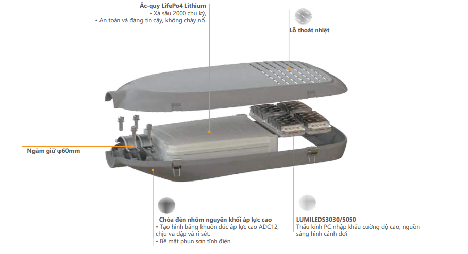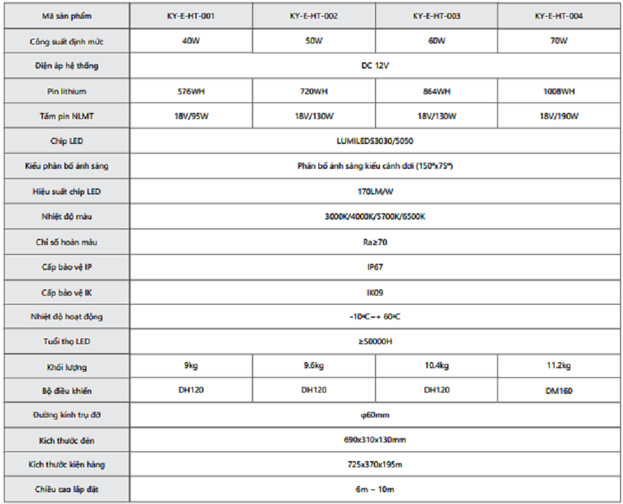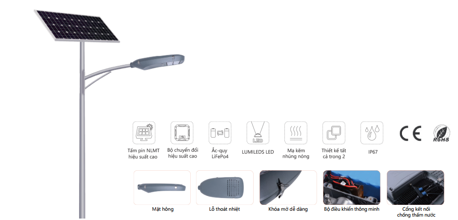 - Smart controller bảo vệ quá áp/dòng và kéo dài thời chiếu sáng khi tình trạng bettery suy yếu ( mưa nhiều ngày)