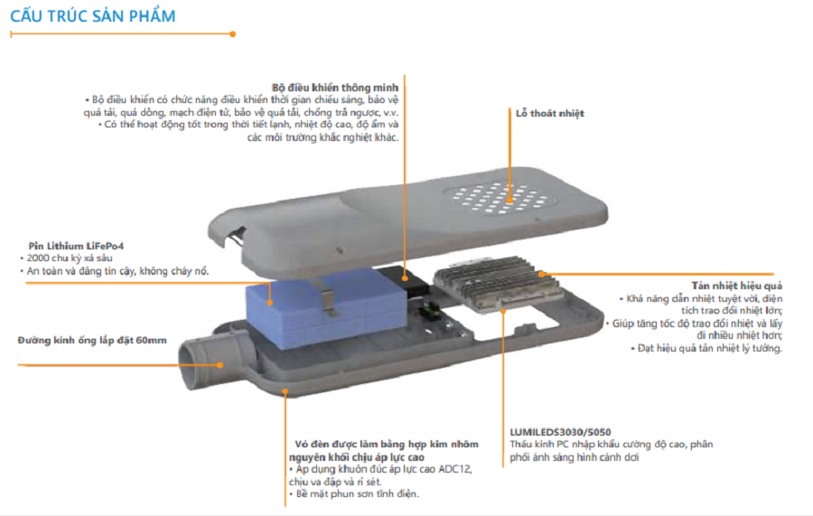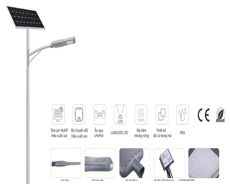- Smart controller bảo vệ quá áp/dòng và kéo dài thời chiếu sáng khi tình trạng bettery suy yếu ( mưa nhiều ngày)