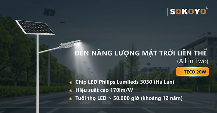 Đèn năng lượng mặt trời SOKOYO TECO 20W All in Two Chiếu sáng đường giao thông đô thị, giao thông nông thôn, biệt thự, khách sạn và khu nghỉ dưỡng…