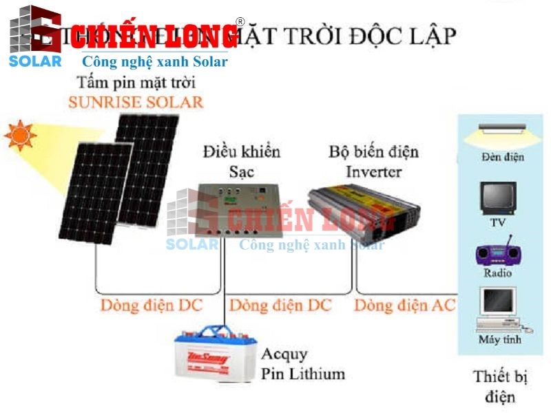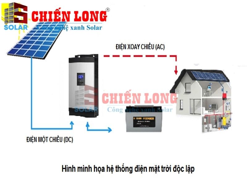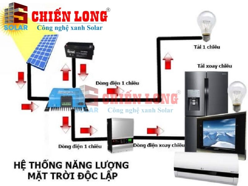 Trái lại, điện mặt trời độc lập bám tải hoạt động tách biệt với nguồn điện lưới quốc gia. Nếu các thiết bị vẫn hoạt động bình thường thì đó là điện có trong pin, bình lưu trữ.