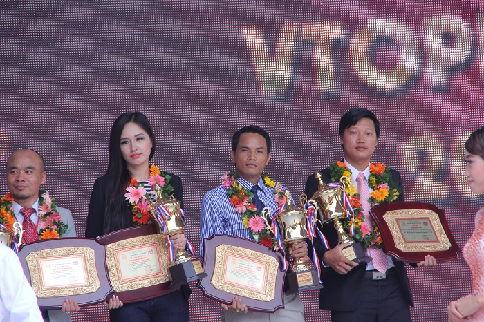 Các Lãnh đạo Doanh nghiệp và hoa hậu Mai Phương Thúy cùng CHIẾN LONG đón nhận cúp VTOPBUILD tại Triển lãm sản phẩm chất lượng cao (Chương trình được Truyền hình HTV9 trực tiếp)