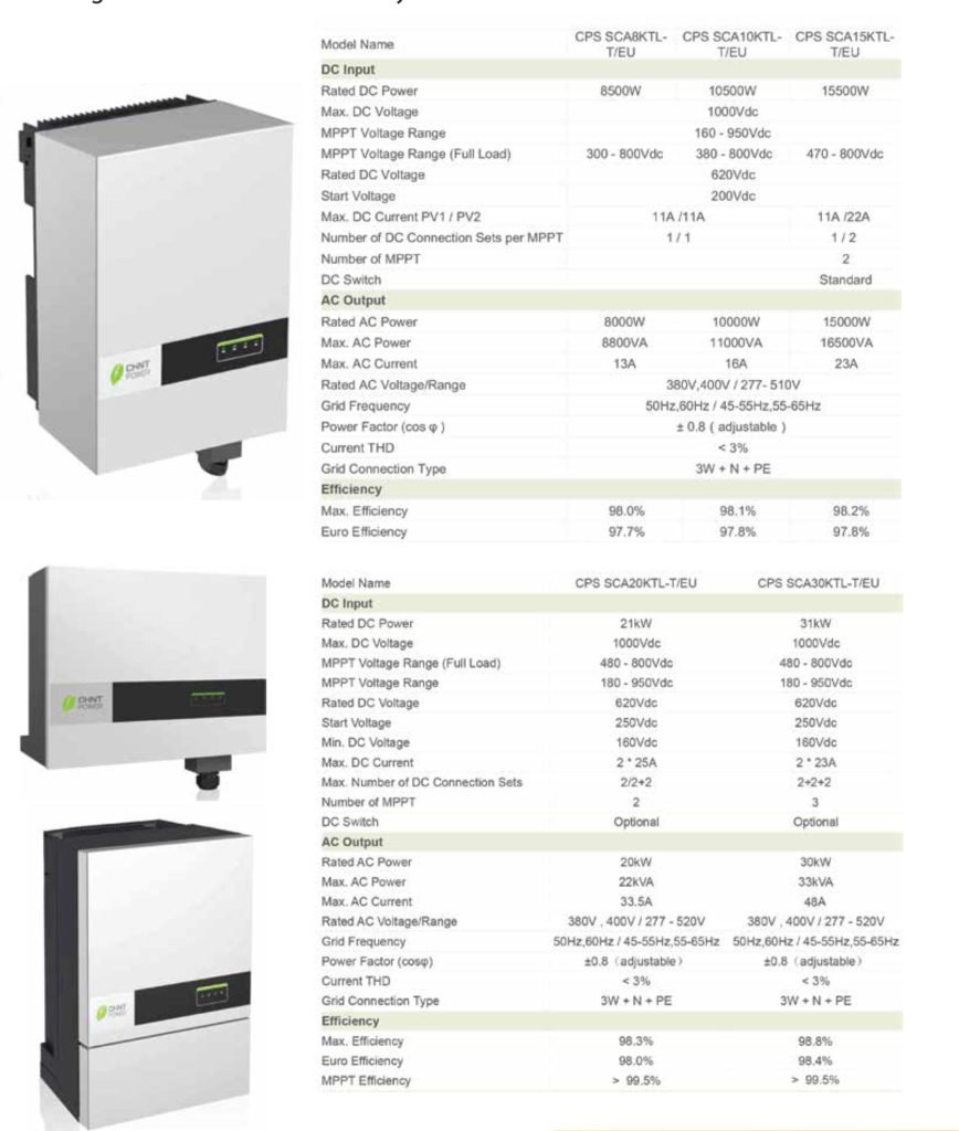 - Biến tần một pha dòng CPS SCA7-8kW là sản phẩm thế hệ mới với hiệu suất cực cao được ra mắt bởi Chint Power System, có thể áp dụng cho các hộ gia đình và môi trường thương mại nhỏ.
