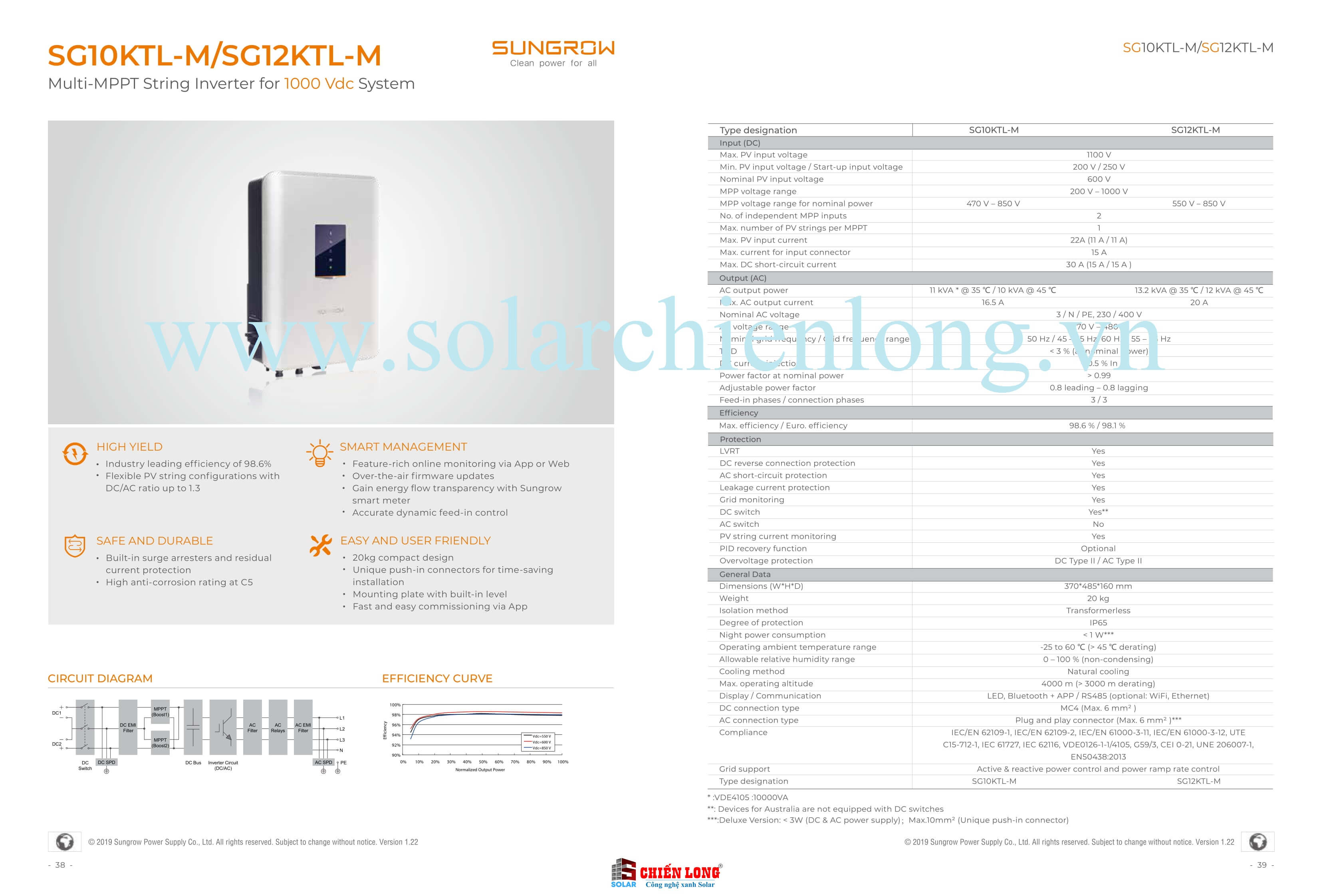 Là dòng thiết bị String inverter công suất 10kW, 2 MPPT. SG10KTL-M có hiệu suất chuyển đổi 98,6%.
