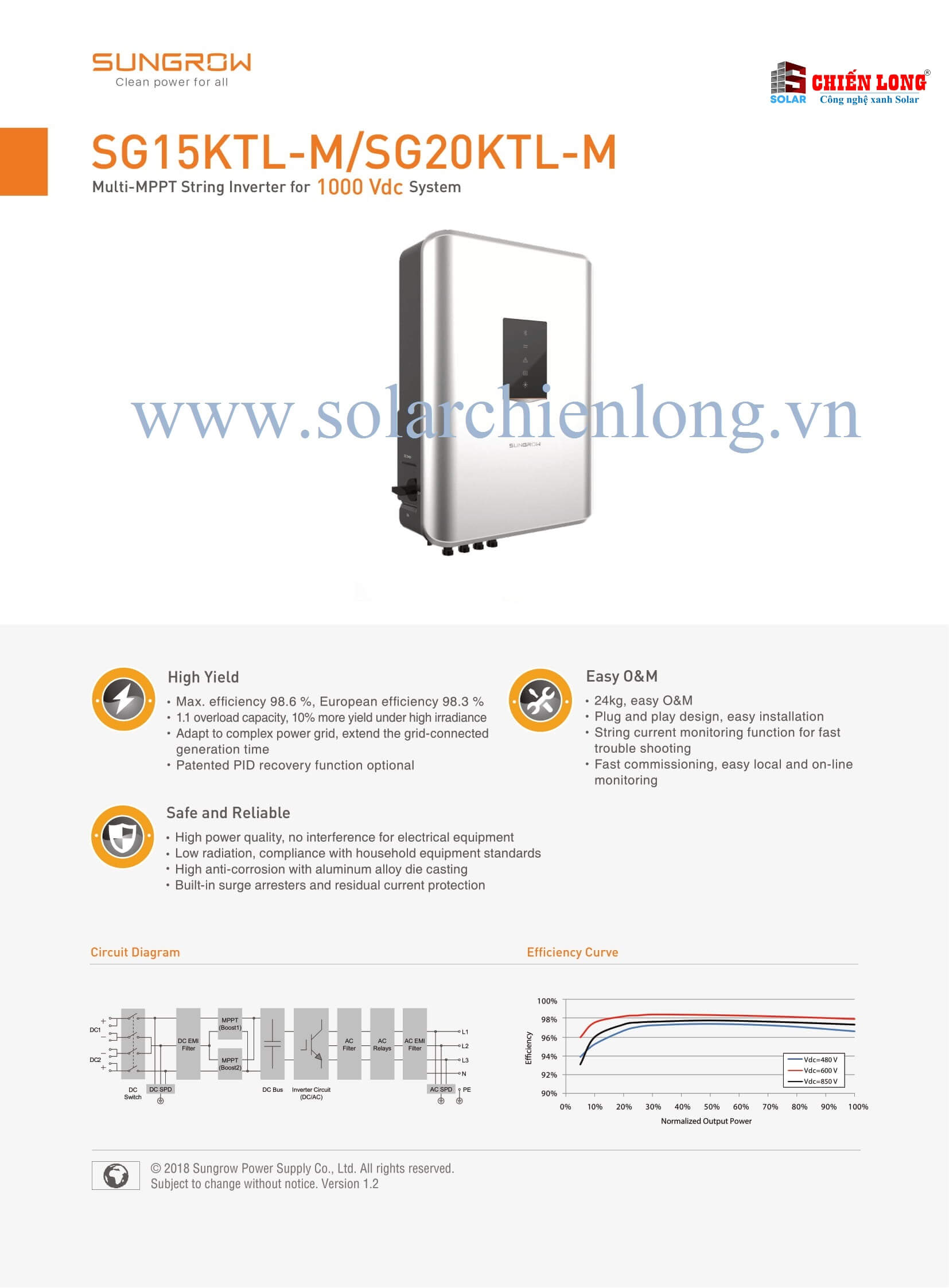 Là dòng thiết bị String inverter công suất 20kW, 2 MPPT. SG20KTL-M có hiệu suất chuyển đổi 98,6%.