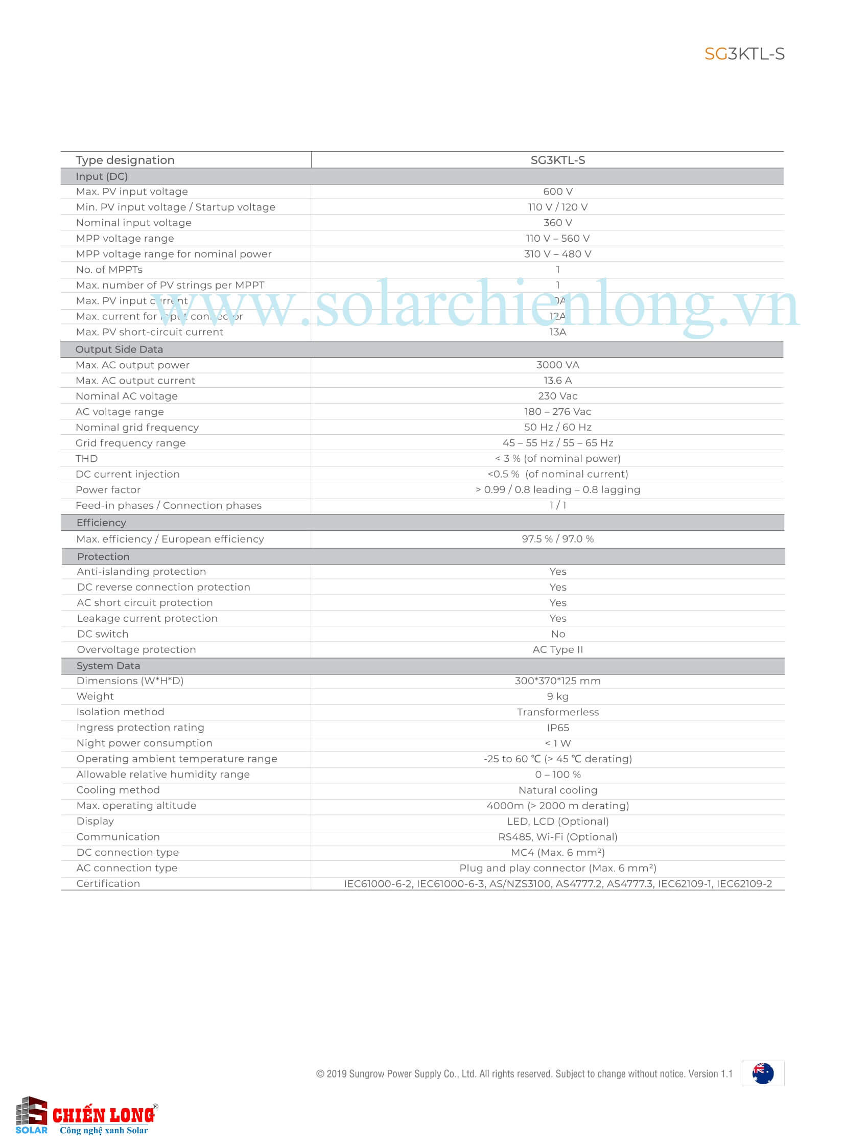 2. Thông số kỹ thuật Inverter Sungrow SG3KTL-S