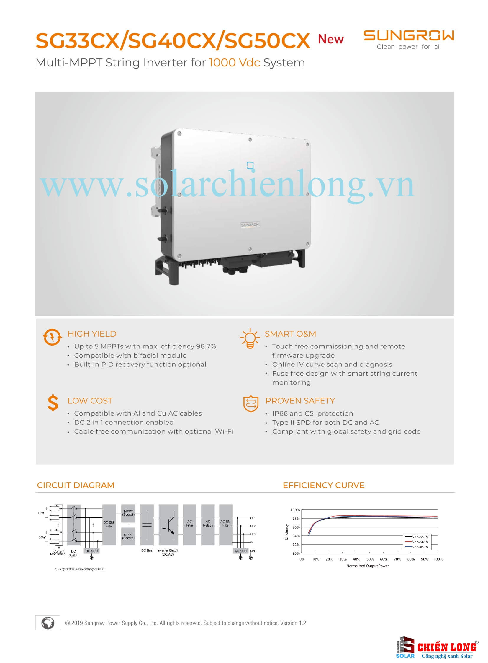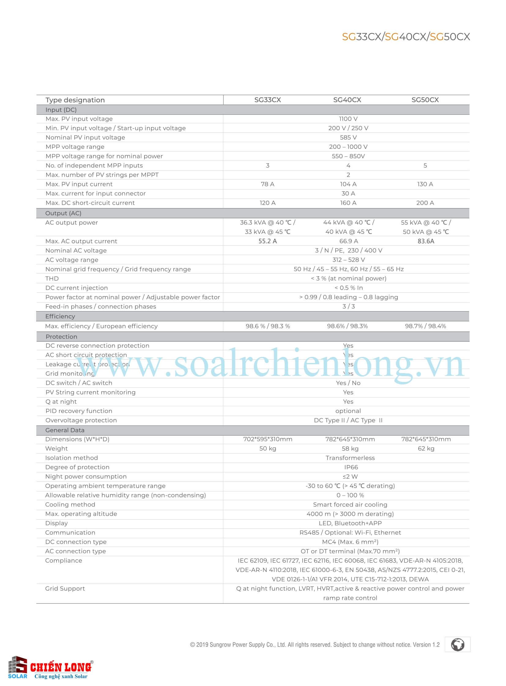 Inverter SG50CX chính hãng Sungrow, là dòng thiết bị String inverter công suất 50kW, 5 MPPT. SG50CX có hiệu suất chuyển đổi 98,7%. Sản phẩm được bảo hành chính hãng 5 năm.