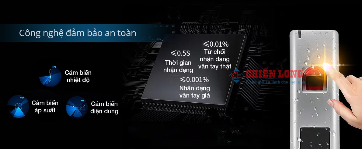 - Đầu đọc vân tay được tích hợp công nghệ an ninh 3 lớp bảo mật chồng chéo với nhau khi nhận vân tay, Cảm biến nhiệt độ, Cảm biến áp suất, Cảm biến diện dung công nghệ này đảm bảo chống lại mọi hành vi copy và làm giả vân tay công nghệ hàng đầu của đức.