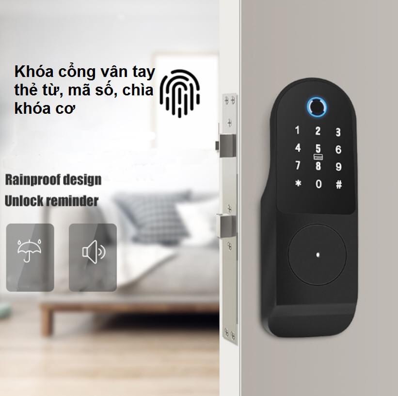 - Chức năng: Mở cửa bằng vân tay, thẻ , Mã số , chìa cơ và 02 remote và Wifi(Optional)