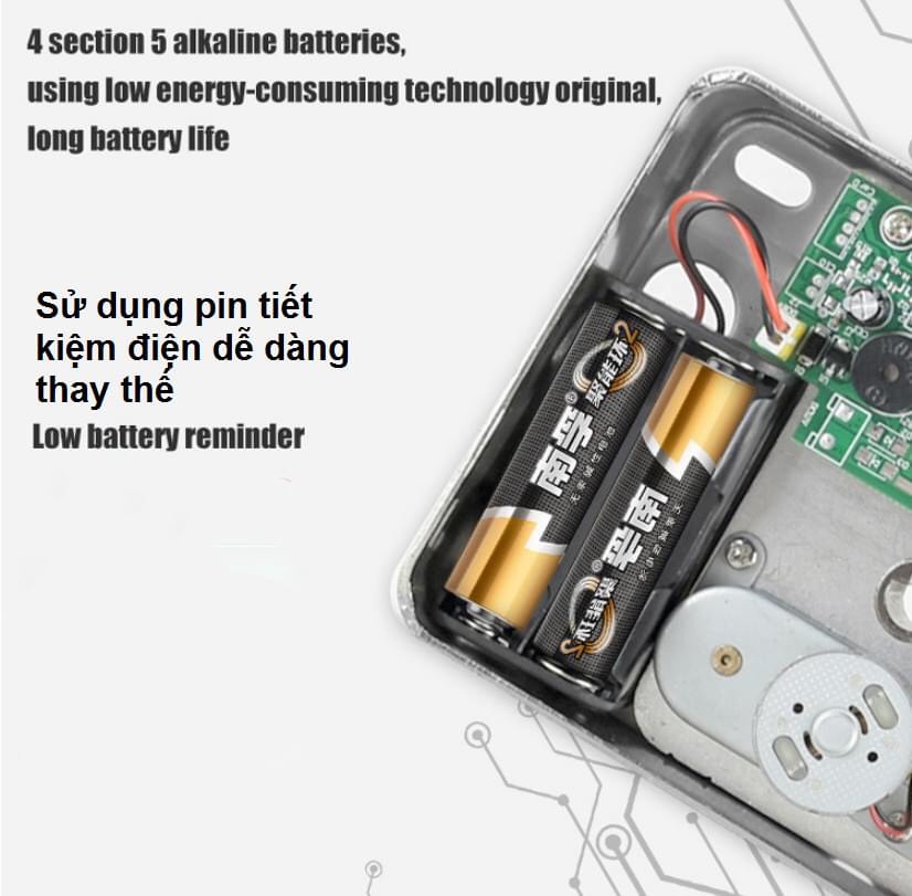 - Sử dụng pin 4 viên PIN AA Hoặc điện 12V. Tiện lợi và an toàn . Dùng cho cửa trong nhà