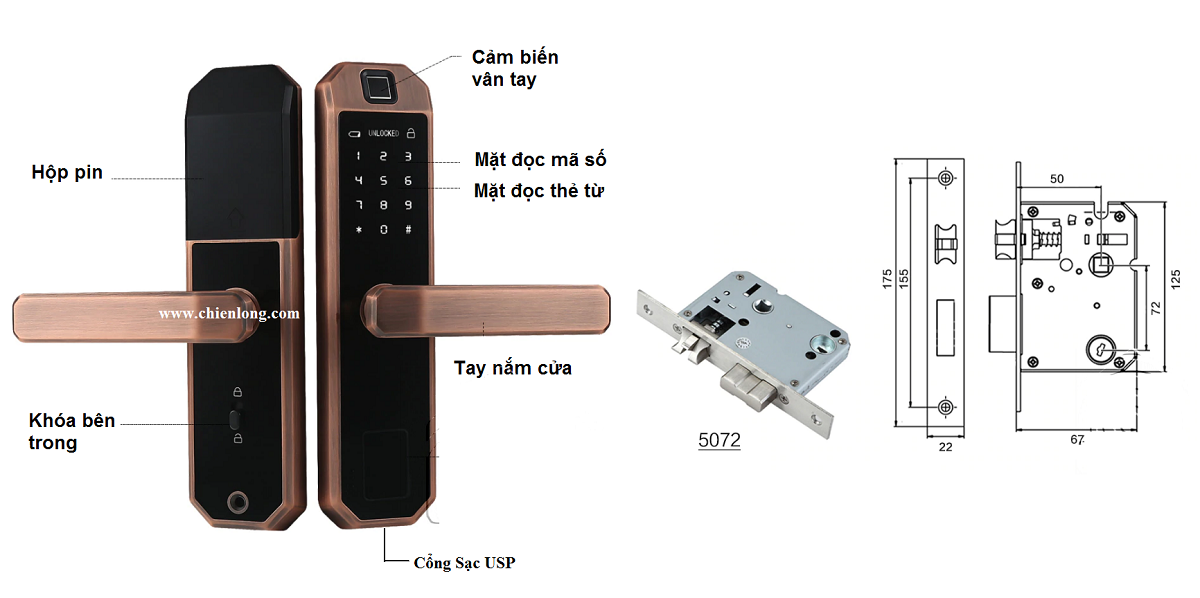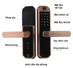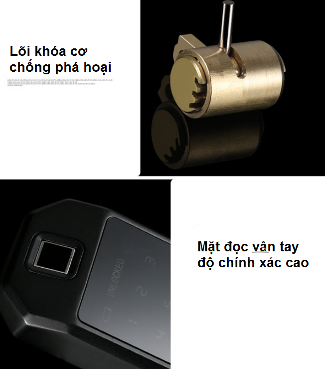 - Cảm biến vân tay nhạy, bàn phím mật mã số cảm ứng có đèn nền LED, cảnh báo bằng giọng nói khi hết pin hoặc đăng nhập sai mật mã.