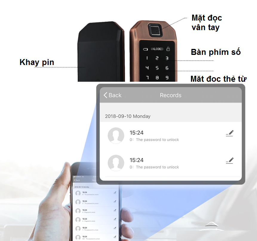 - Cảnh báo khi có người phá khóa, hỏa hoạn, hết pin.