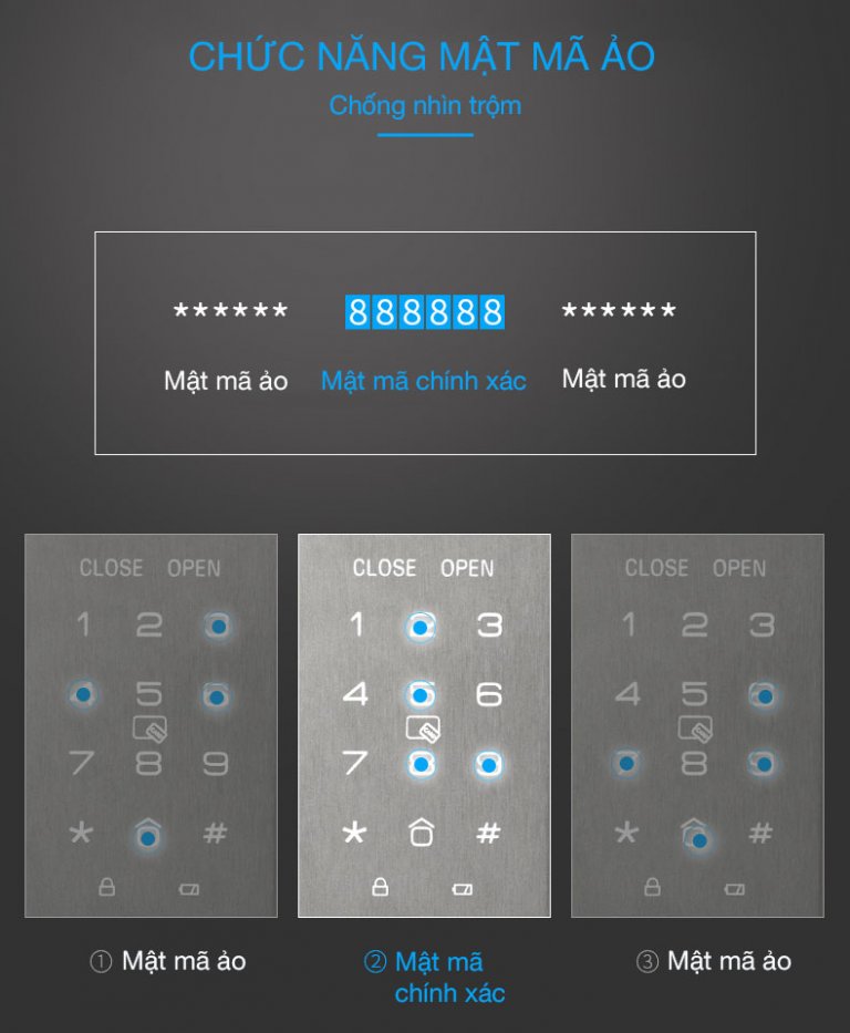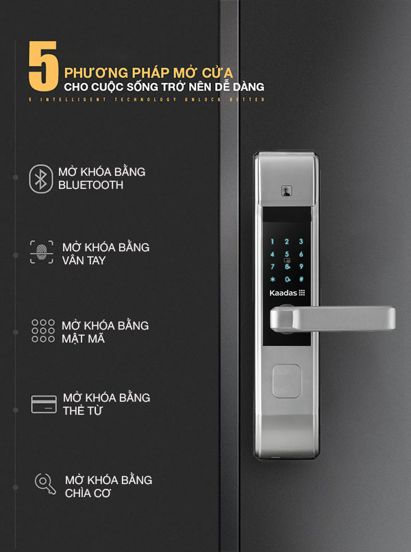 • Phương thức mở cửa: Vân tay, Mã số, Thẻ từ, Chìa cơ