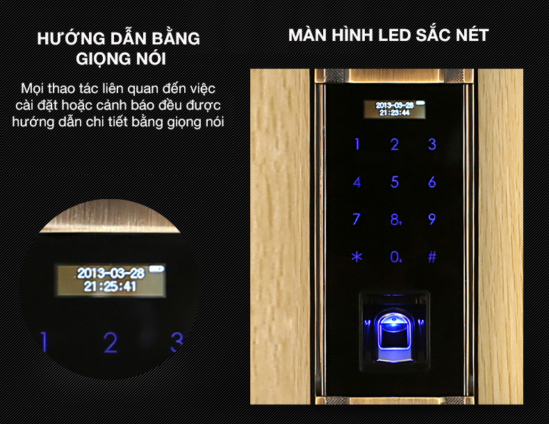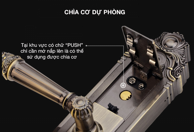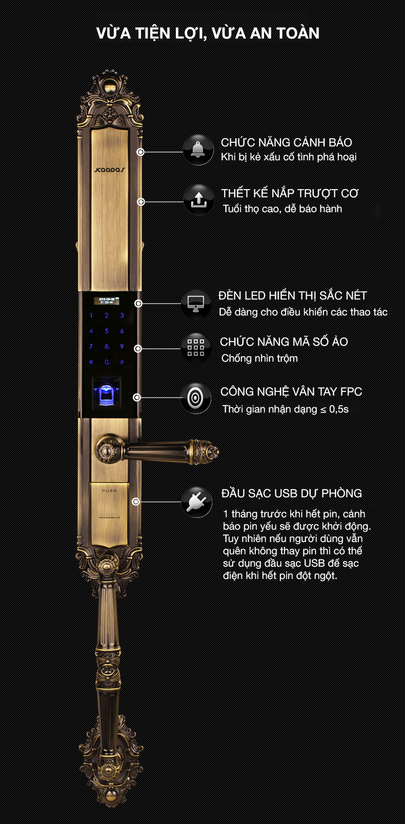 - Phương thức mở cửa: Vân tay, Mã số, Thẻ từ, Chìa cơ, Điều khiển