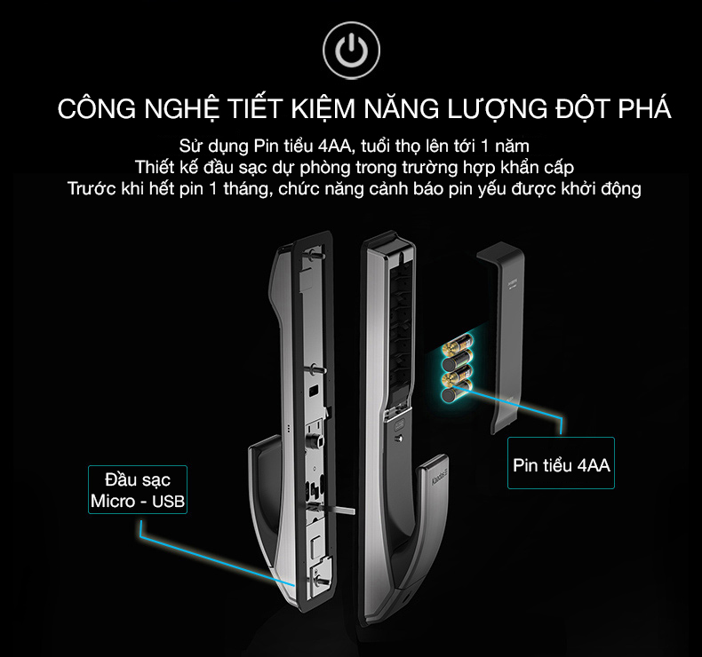 Vì không sử dụng đèn led để nhận dạng vân tay nên K7 khá tiết kiệm năng lượng. Thời gian sử dụng lên tới 365 ngày. Ngoài ra nếu người dùng vẫn quên chưa thay pin kịp thời thì có thể sử dụng đầu sạc dự phòng hoặc chìa cơ để mở cửa. Hạn chế tối đa những phiền phức do việc hết pin đột ngột xảy ra.