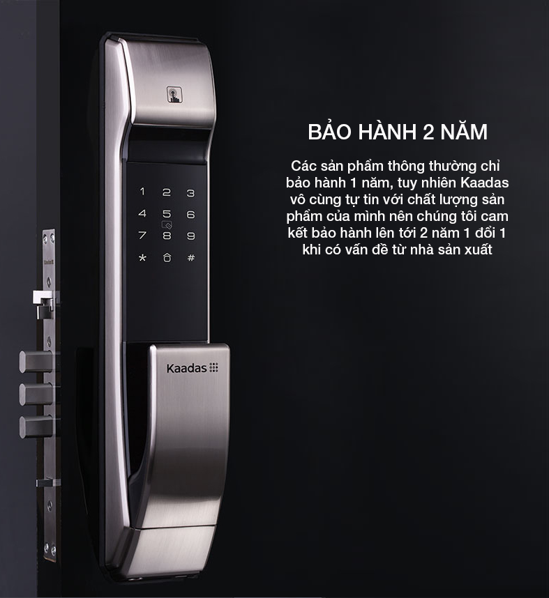 Thông thường các thương hiệu khác chỉ được bảo hành 1 năm. Đối với Kaadas, do các sản phẩm được sản xuất trên một dây chuyền hiện đại và quy trình giám sát nghiêm ngặt. Tất cả các loại khóa của Kaadas đều được ra đời thông qua việc chọn lọc kỹ lưỡng về nguyên vật liệu. Thế nên Kaadas nói chung và K7 nói riêng đều được nhà sản xuất cam kết bảo hành lên tới 2 năm. Một thời gian qua dài để chứng minh về độ bền của sản phẩm.