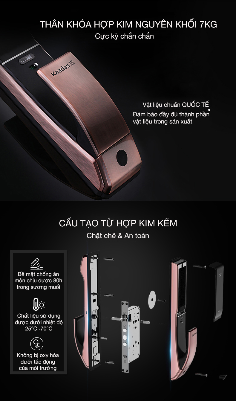 Kaadas K7 sử dụng vật liệu tiêu chuẩn Châu Âu – inox 304. Vì vậy được cấu tạo nguyên khối chắc chắn nên K7 có độ bền rất cao. Tổng trọng lượng lên tới 7kg. Đối với các sản phẩm khác trên thị trường, chất liệu được pha nhựa rất nhiều nên trọng lựa chỉ bằng 1/2 so với Kaadas K7. Người dùng sẽ không khỏi lăn tăn khi lựa chọn K7 với những dòng khóa khác trên thị trường khi chưa biết được bí mật này. Vì pha trộn nhựa nên các sản phẩm đại trà trên thị trường sau một thời gian sử dụng sẽ bị trình trạng hỏng hóc, bạc màu, giòn, gẫy. Với K7 bạn không còn phải lo lắng về vấn đề này nữa. Siêu bền cả về thời gian sử dụng lẫn mỹ quan.