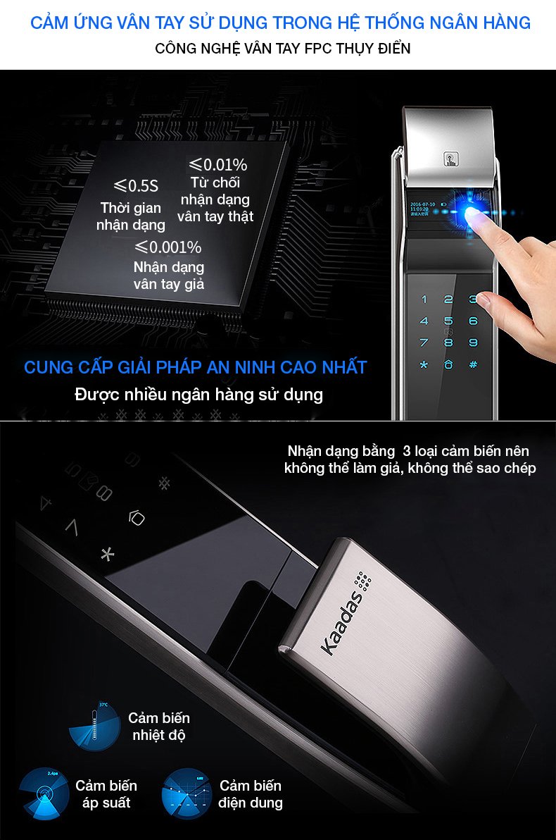 FPC là công nghệ vân tay hiện đại nhất trong thị trường khóa cửa hiện nay. Khác với những thương hiệu sản xuất đại trà, họ sử dụng công nghệ lạc hậu là cảm biến quang học. Công nghệ này dựa vào đèn led để chụp ảnh vân tay. Việc bảo mật cho ngôi nhà là vô cùng lỏng lẻo khi việc chụp ảnh vân tay làm giả là vô cùng dễ dàng. Với FPC, nhà sản xuất thiết kế nhận dạng dựa trên cảm biến nhiệt độ, điện dung và áp suất. Tỷ lệ nhận dạng vân tay giả chưa tới 0.001%. Con số này nói lên rằng việc làm giả vân tay là gần như không thể. Người dùng khi đặt vân tay lên khu vực nhận dạng vân tay và chỉ chưa đầy 0.5 giây thì cửa sẽ được mở. Độ nhận diện cực nhanh, cực nhạy. Chưa hết, với các loại cảm ứng thông thường thì dùng thời gian lâu mắt đọc vân tay sẽ không nhạy như thời gian đầu nữa. Với công nghệ FPC thì càng sử dụng lâu thì dễ dàng đọc vân tay. Vì thế, K7 chính là sự lựa chọn hoàn hảo cho những tín đồ yêu thích sử dụng vân tay.