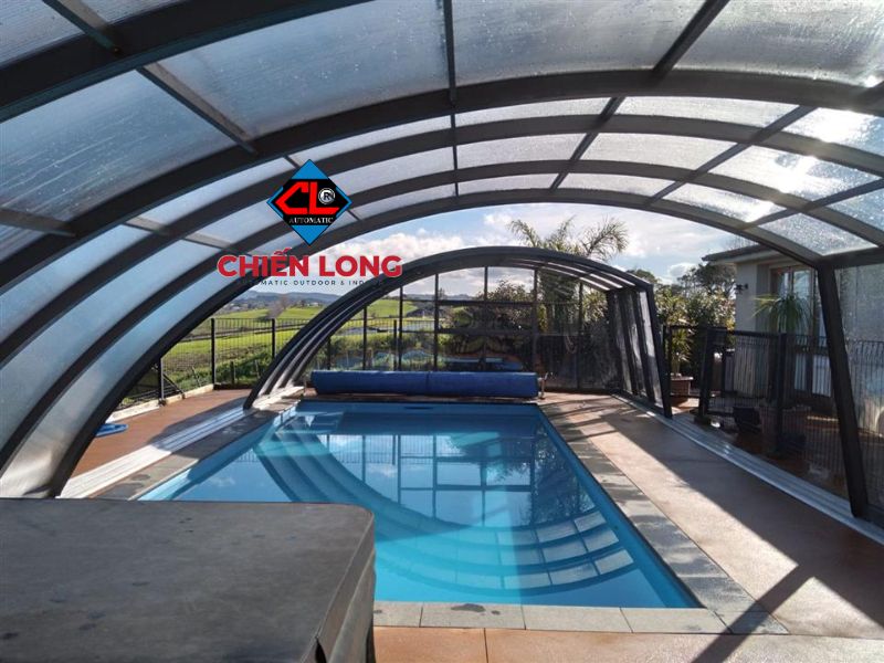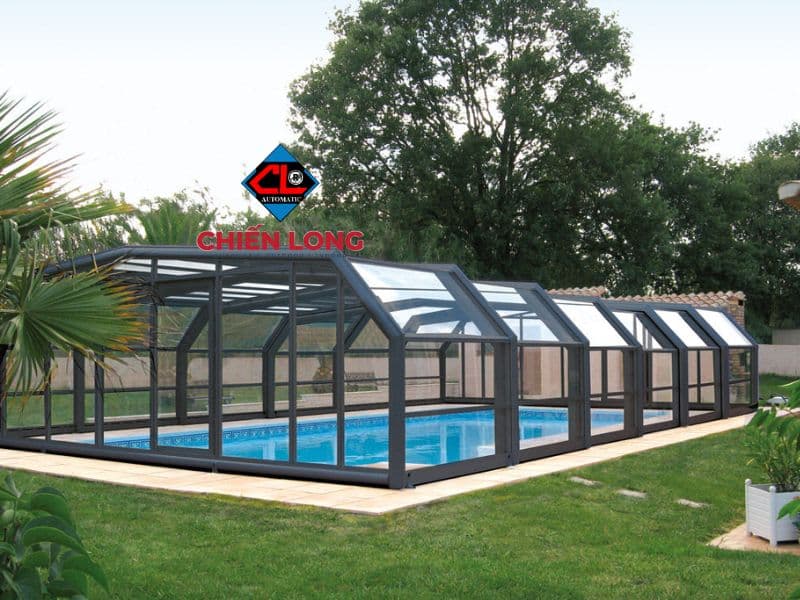 Mái che hồ bơi có diện tích lớn, được xây dựng để che nắng và mưa cho hồ bơi ngoài trời. Hệ thống điều khiển thông minh cho phép việc sử dụng và thu xếp mái che hồ bơi linh hoạt tại mọi thời điểm.