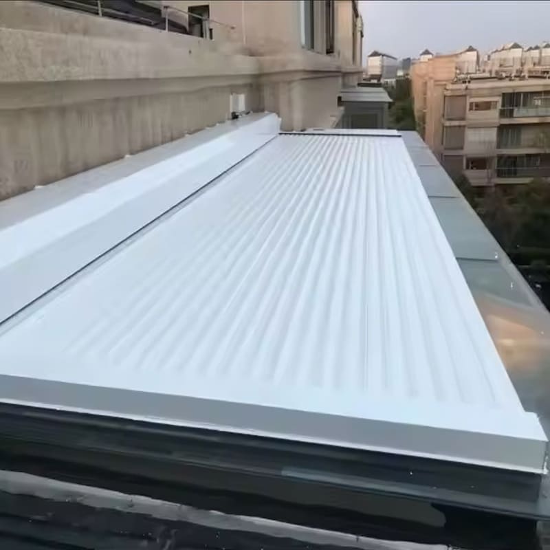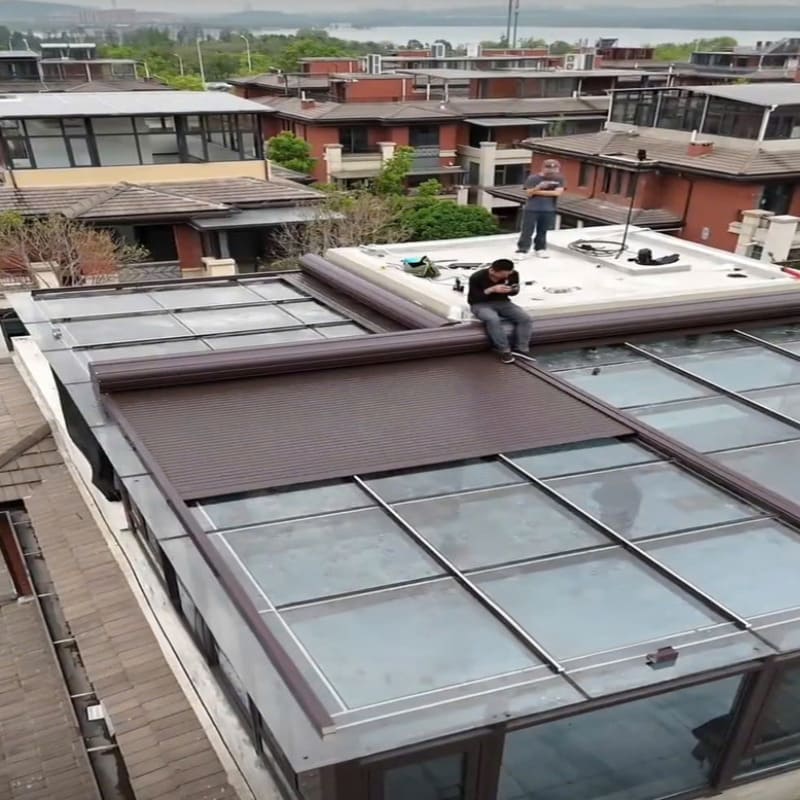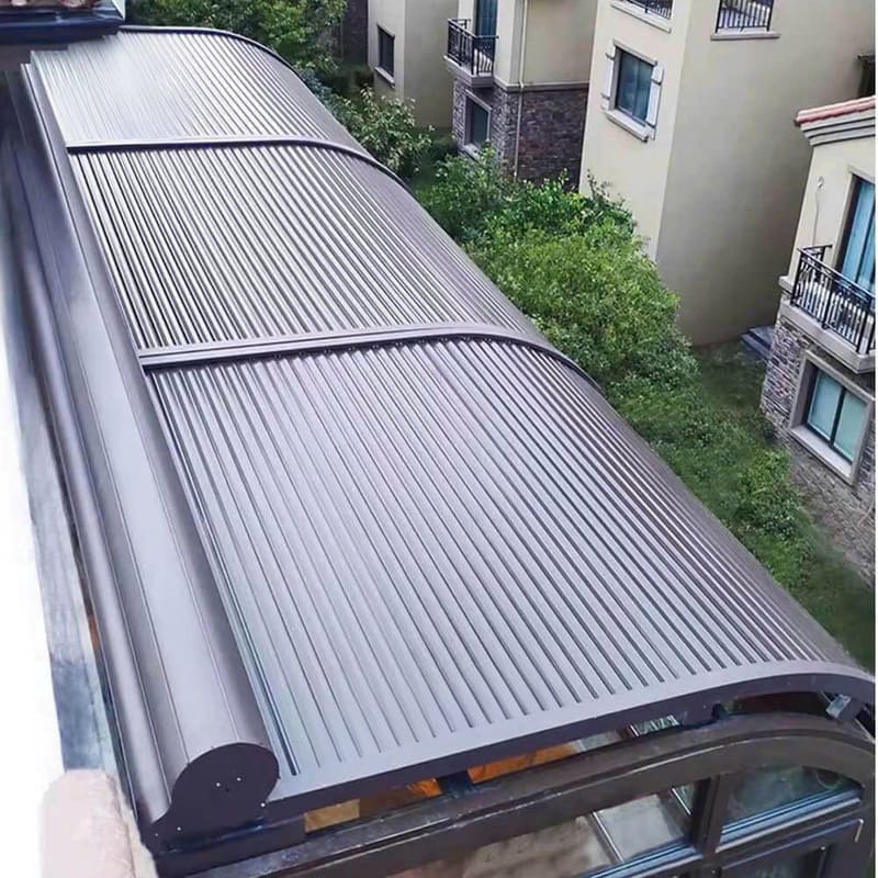Đây là một loại mái che thông minh được làm từ lá nhôm hợp kim cao cấp, lắp đặt phía trên mái kính và có khả năng đóng – mở tự động bằng motor hoặc remote. Khi cần lấy sáng, người dùng mở góc lá nhôm; khi cần che nắng – chống mưa, chỉ cần bấm nút là mái sẽ khép lại hoàn toàn.