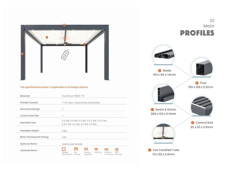 Với thiết kế sang trọng và chất liệu Aluminum 6063-T5 cao cấp, mái xếp Pergola Aluminum không chỉ tạo nên vẻ đẹp hiện đại mà còn đảm bảo độ bền bỉ và độ ổn định trong mọi điều kiện thời tiết.