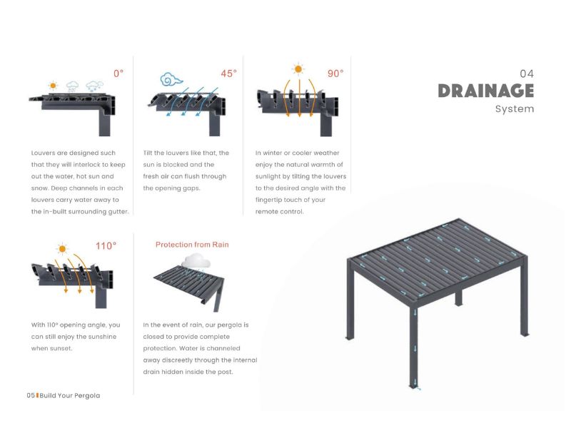 Mái xếp Pergola Aluminum có thể điều chỉnh ánh sáng và nhiệt độ trong không gian dưới mái xếp. Bạn có thể điều chỉnh độ xếp lật của mái xếp để kiểm soát lượng ánh sáng và lượng nhiệt được chặn.