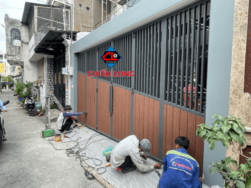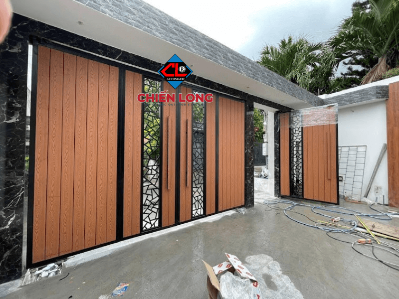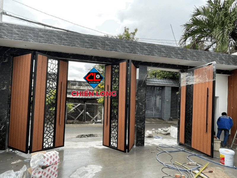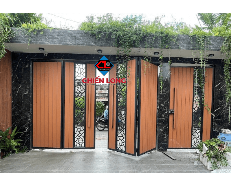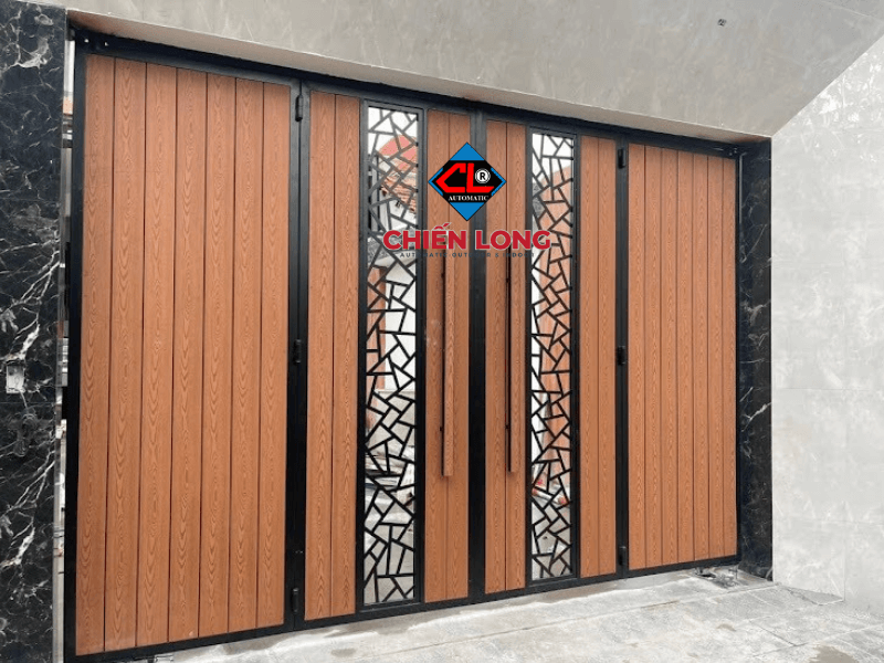 Mẫu cổng sắt 4 cánh ốp tấm Composite nhựa giả gỗ ngoài trời CL00106