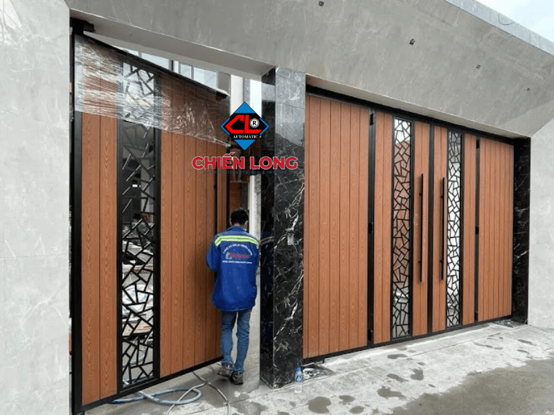 - Mẫu cổng sắt 4 cánh ốp nhựa giả gỗ 2 mặt ngoài trời CL0080 - Phối hoa văn cắt CNC thiết kế hiện đại