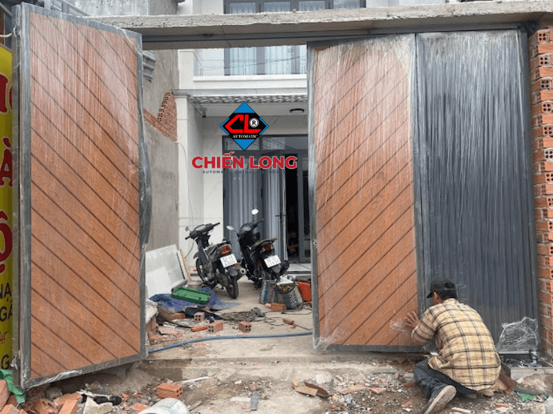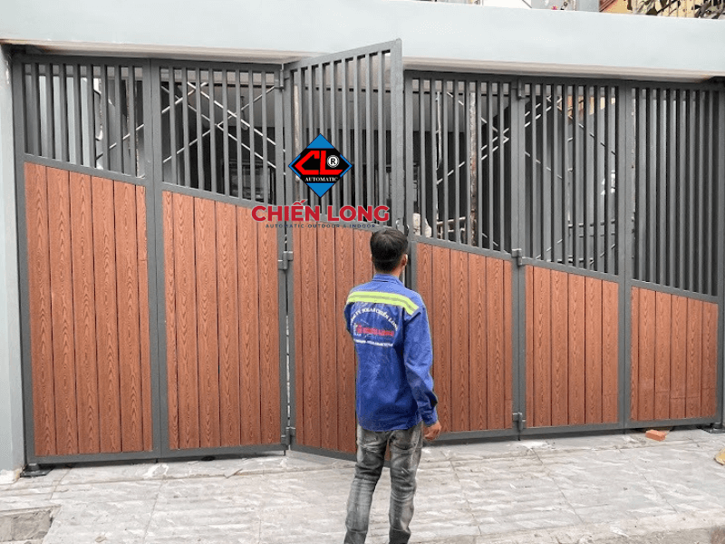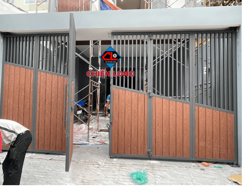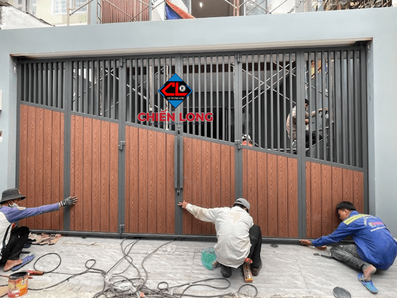 - Mẫu cổng sắt 4 cánh ốp nhựa giả gỗ CL00101
