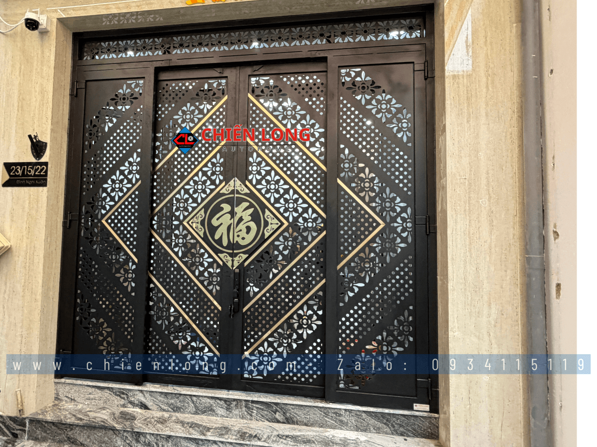 3. Mẫu Cổng Sắt 4 Cánh Trượt Quay Chữ Phước Phong Thủy