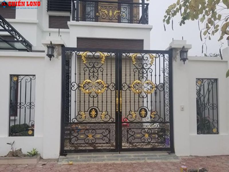 Tính thẩm mỹ: Cổng sắt uốn nghệ thuật theo phong cách Châu Âu hoài cổ với đường nét mềm mại, hoạ tiết sống động giúp nâng tầm sự sang trọng cho tổng thể công trình. Màu sơn được kết hợp hài hoà với các họa tiết được trảm trổ màu vàng đồng nổi bật trên nền đen.