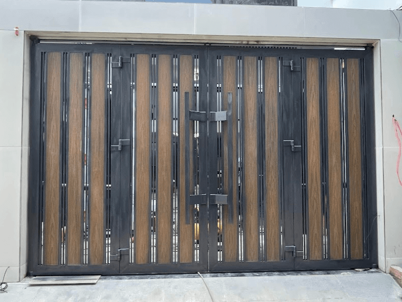 2. Đơn vị thi công mẫu cửa cổng 4 cánh xếp ốp Gỗ nguyên sinh + Bề mặt phủ PVDF/ASA, chống tia UV giá tốt