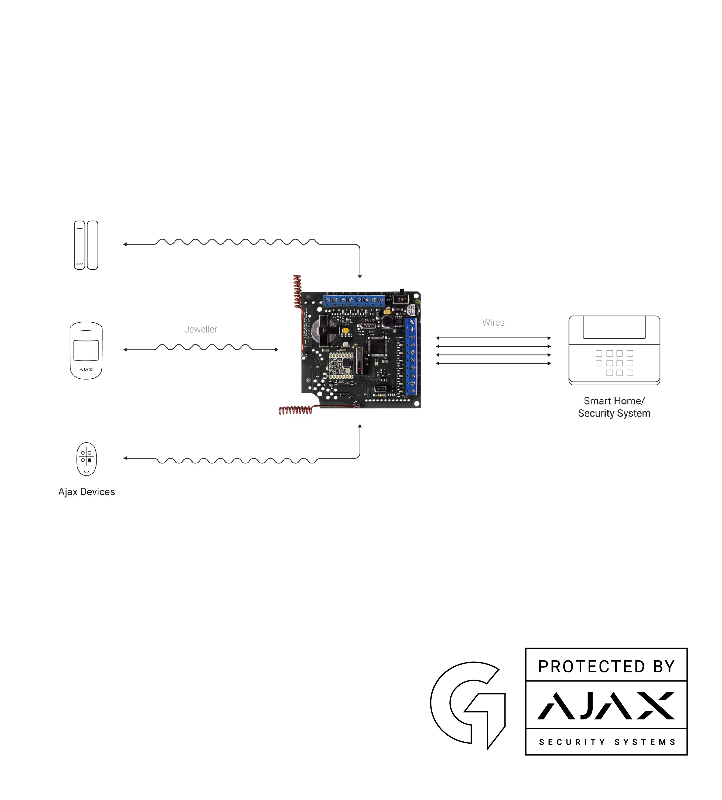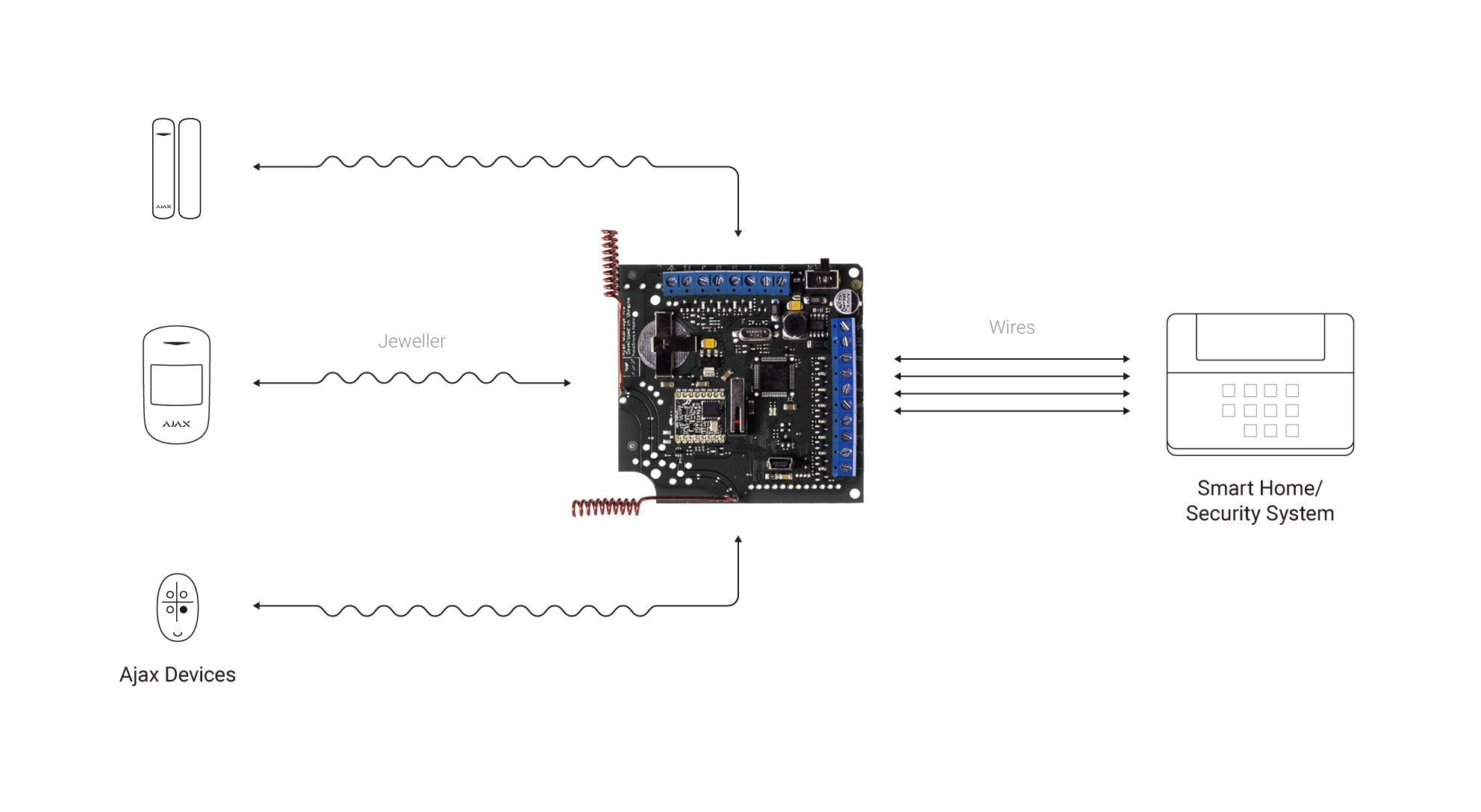 Modun thu nhận giúp kết nối các thiết bị cảm ứng của Ajax vào hệ thống an ninh có dây hoặc hybrid. Thiết bị sẽ được tích hợp vào các bộ phận trung tâm với các khu vực an ninh kết nối dây.