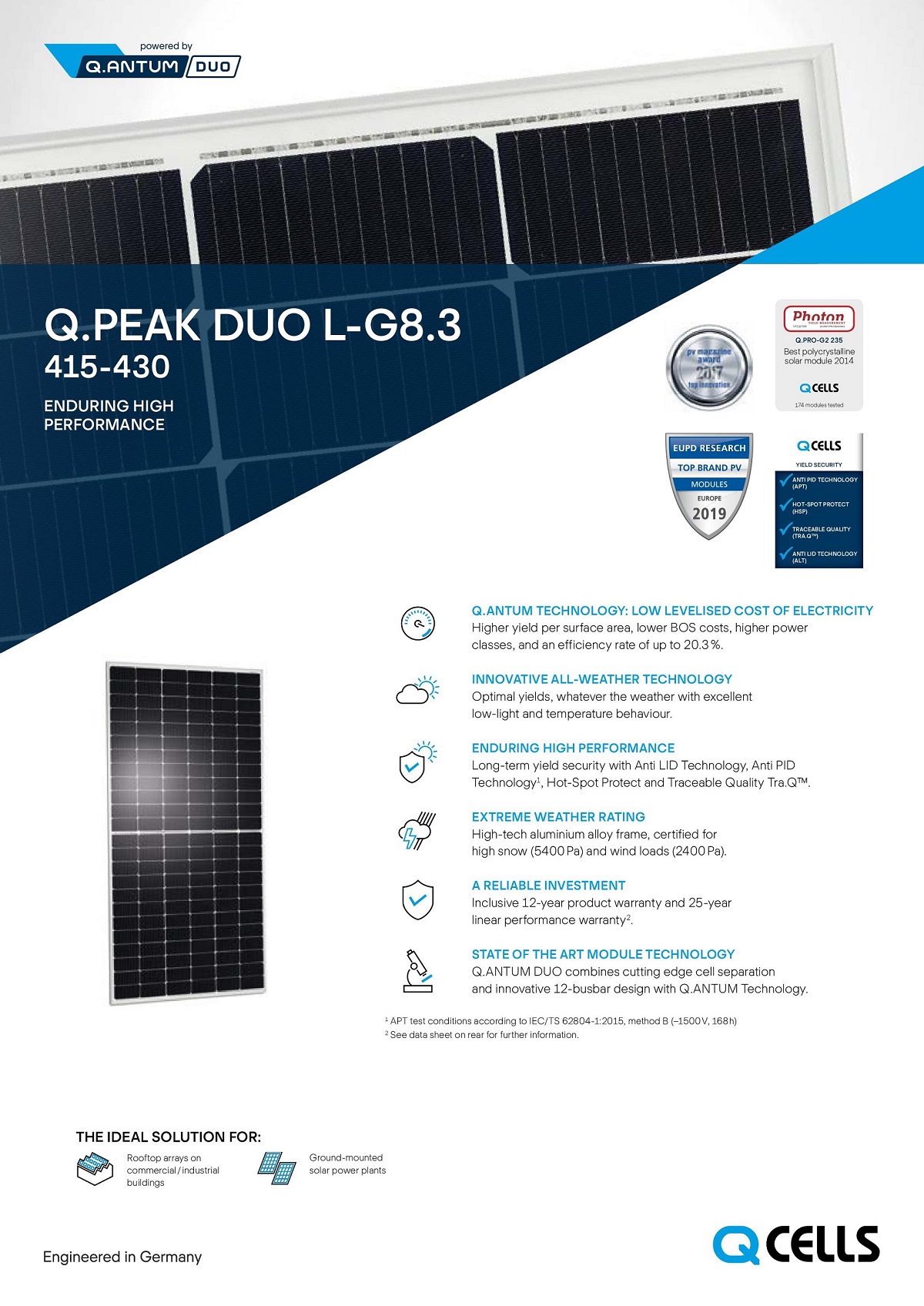 QCells Q.Peak Duo L-G8.3 415 (Qcells 415) là dòng sản phẩm sử dụng nguyên liệu monocrystalline cao cấp – công nghệ cải tiến vượt bậc của thương hiệu tấm pin năng lượng mặt trời Hanwha QCells – thuộc tập đoàn Hàn Quốc tại Việt Nam.
