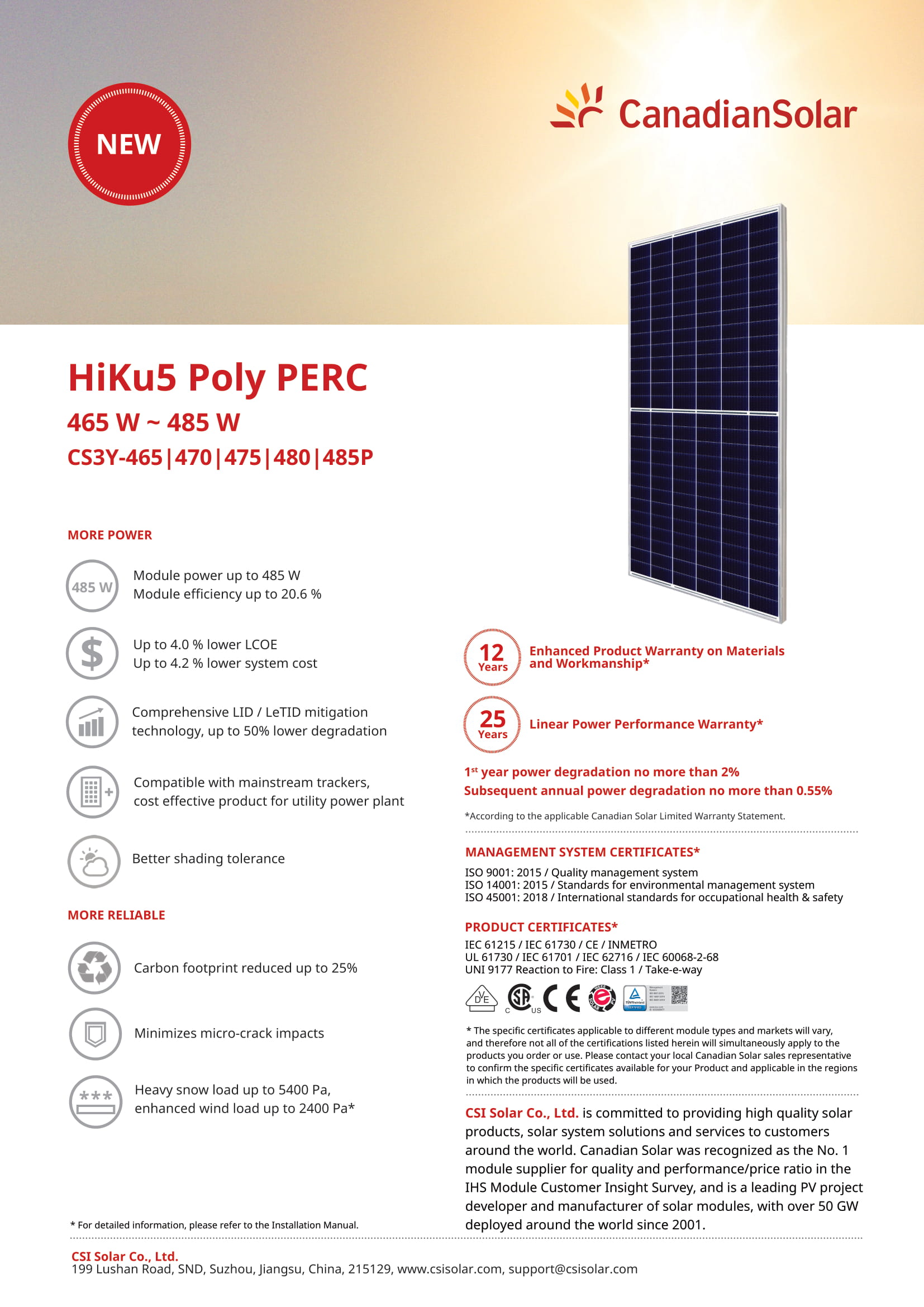 Tấm pin Canadian HiKu5 CS3Y 465p Công nghệ mới 2021 của Hãng Canadian, Hãng Canadian sẽ cho ra mắt vào tháng 6/2021 là một sản phẩm hứa hẹn nhiều tính năng ưu việt và chuyển đổi hiệu suất cao.