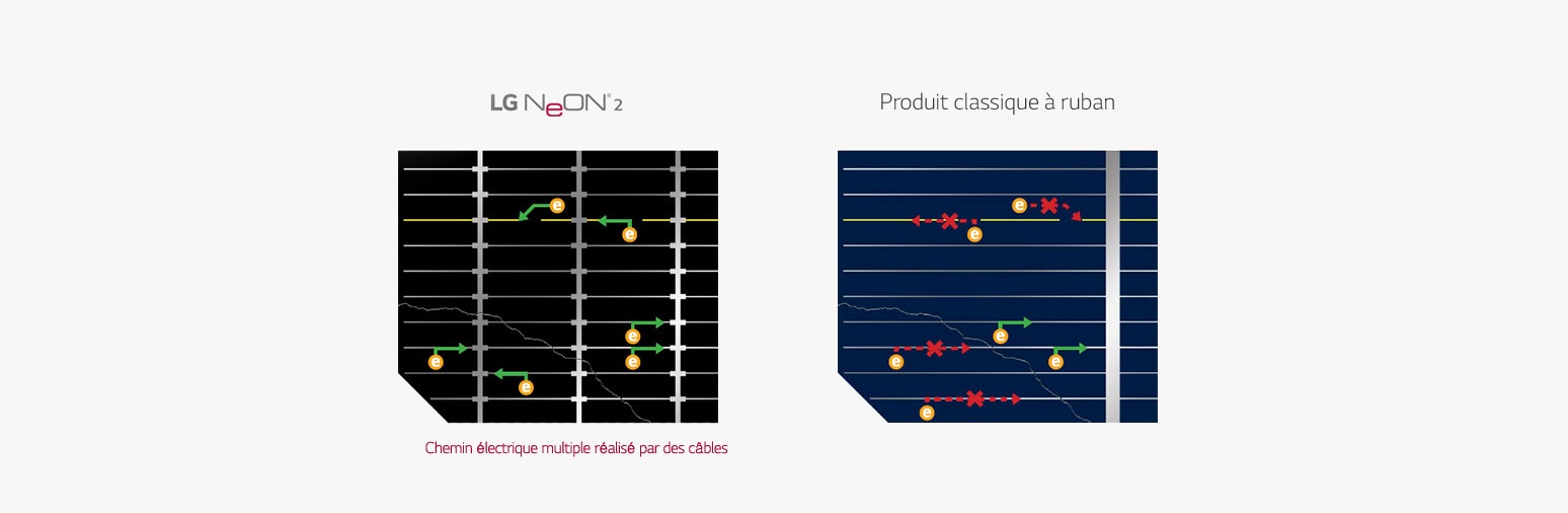 Khi xảy ra những vết rạn nứt hoặc do sự ăn mòn điện cực của những vân cell ( tế bào quan điện) do sự xuống cấp tự nhiên của những vùng xung quanh Cell pin mặt trời làm cho những điện tích (e) được sinh ra không di chuyển được tới các busbar dẫn điện gây ra sự giản hiệu năng của tấm pin mặt trời. Tấm pin mặt trời LG Neon® 2 với công nghệ 12 busbar được bố trí đều mặt Cell luôn đảm bảo điện tích (e) được tới các busbar, đảm bảo hiệu suất của tấm pin mặt trời LG.