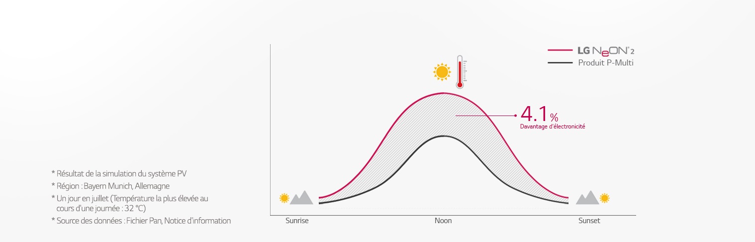 Tấm pin mặt trời LG Neon® 2 tạo ra nhiều năng lượng hơn các tấm pin mặt trời loại P thông thường khác 4.1% trong điều kiện nhiệt độ cao cũng nhưng trong điều kiện bức xạ thấp