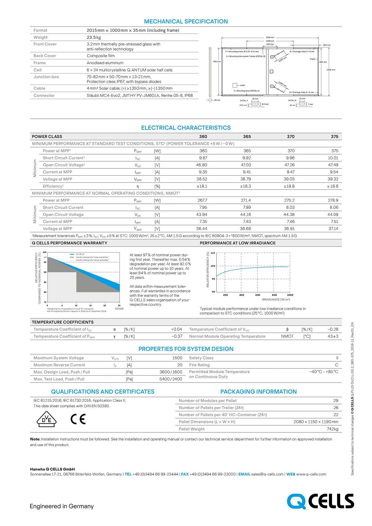 Thông số kỹ thuật tấm pin NLMT Qcells 365
