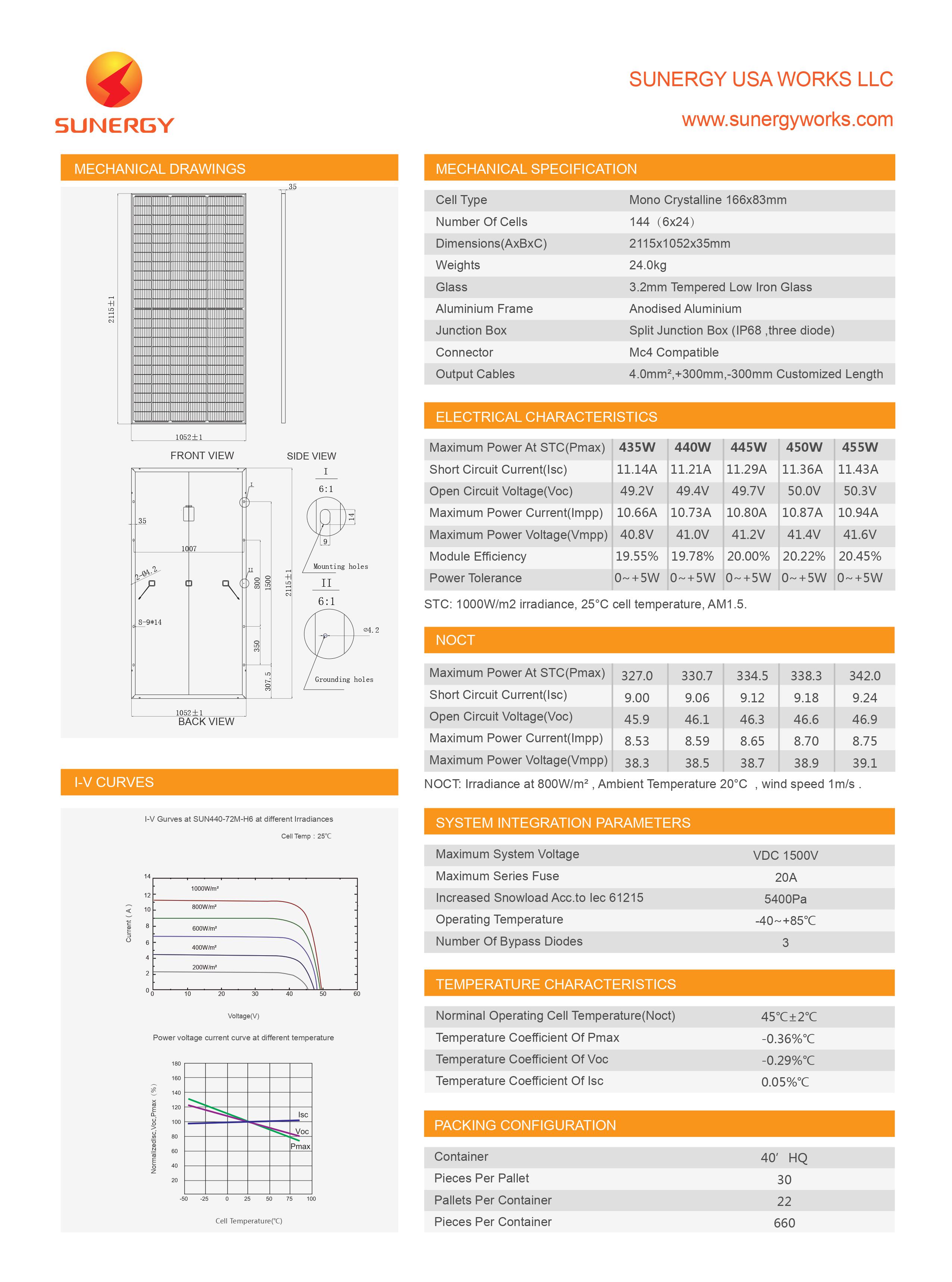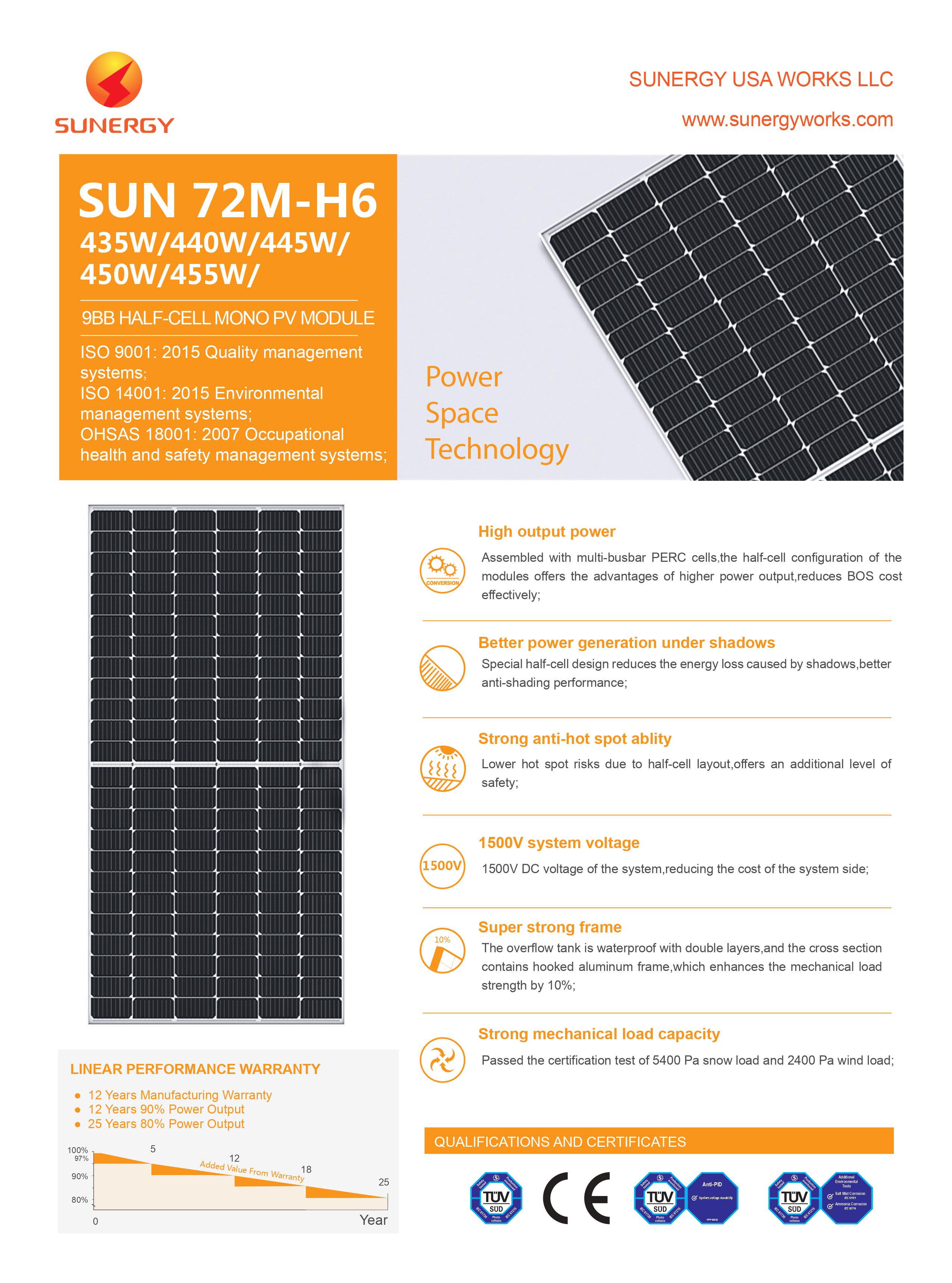 Catalogue tấm pin năng lương mặt trơì Sunergy 450W Mono 166 half cut cells.