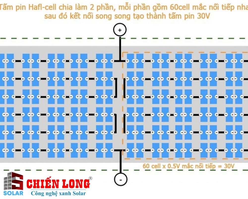 Những mô-đun Half-Cells chính là những cell quang điện cắt làm đôi. Nhờ có điều này mà làm cho mô-đun được bền lâu hơn cũng như hiệu suất được cải thiện rõ rệt. Những tấm pin cell truyền thống 60 hay 72 cell sẽ trở thành loại 120 với 144 cell một nửa tương ứng. Cell khi được cắt đôi cũng đồng nghĩa là dòng điện bị giảm đi một nửa. Cho nên tổn thất điện trở cũng giảm xuống, từ đó cell cũng tạo ra được nhiều năng lượng hơn.